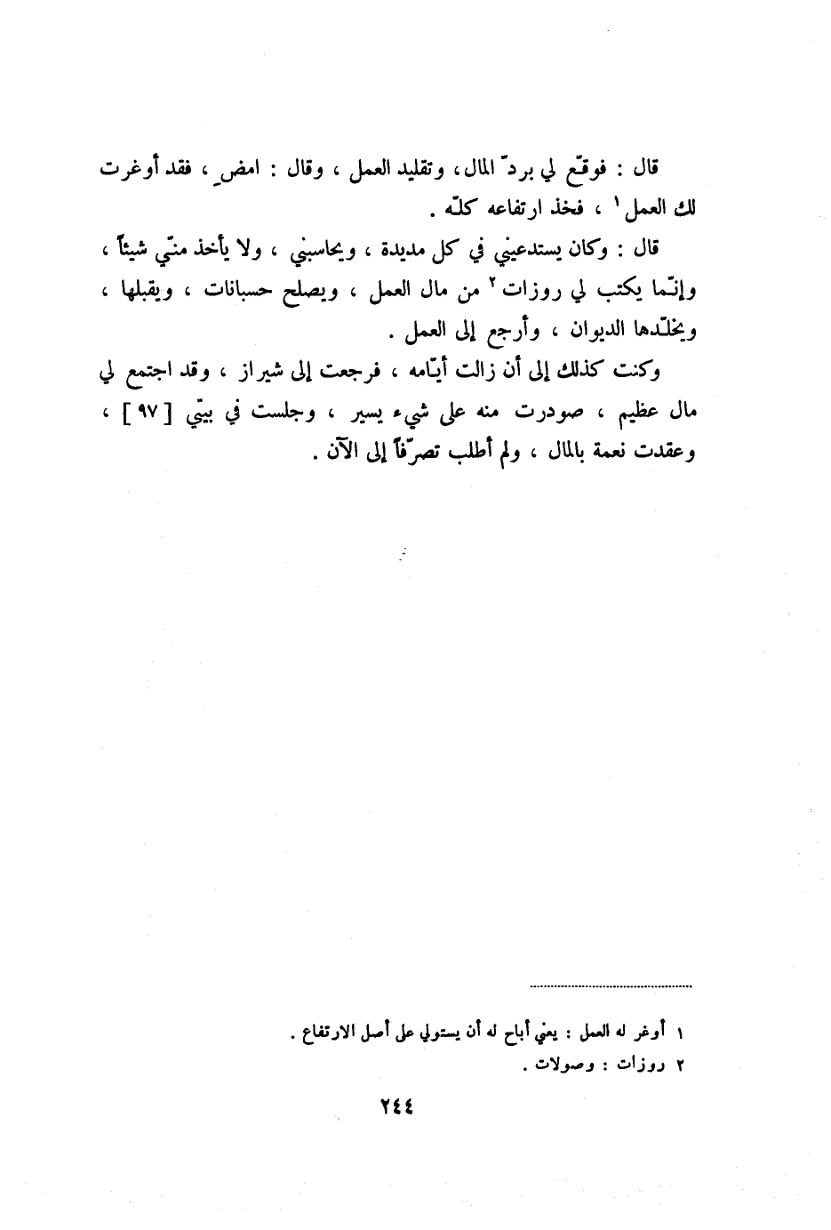 وكنت كذلك إلى أن زالت أيّامه، فرجعت إلى شيراز، وقد اجتمع لي مال عظيم، صودرت منه على شيء يسير، وجلست في بيتي [97] ، وعقدت نعمة بالمال، ولم أطلب تصرّفا إلى الآن.