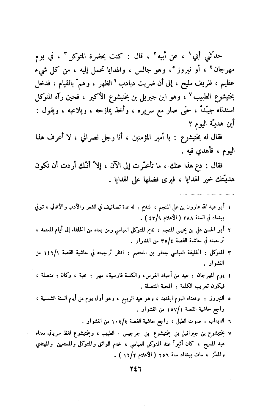 حدّثني أبي «1» ، عن أبيه «2» ، قال: كنت بحضرة المتوكل «3» ، في يوم مهرجان «4» ، أو نيروز «5» ، وهو جالس، والهدايا تحمل إليه، من كل شيء عظيم، ظريف مليح، إلى أن ضربت دبادب «6» الظهر، وهمّ بالقيام، فدخل بختيشوع الطبيب «7» ، وهو ابن جبريل بن بختيشوع الأكبر، فحين رآه المتوكل استدناه جيّدا، حتى صار مع سريره، وأخذ يمازحه، ويلاعبه، ويقول: