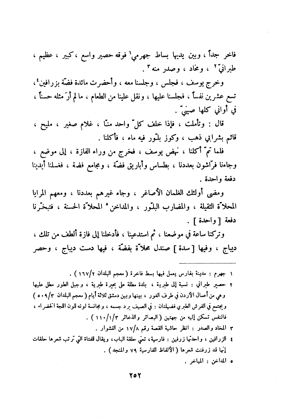 وخرج يوسف، فجلس، وجلسنا معه، وأحضرت مائدة فضّة بزرافين «4» ، تسع عشرين نفسا، فجلسنا عليها، ونقل علينا من الطعام، ما لم أر مثله حسنا، في أواني كلها صينيّ.