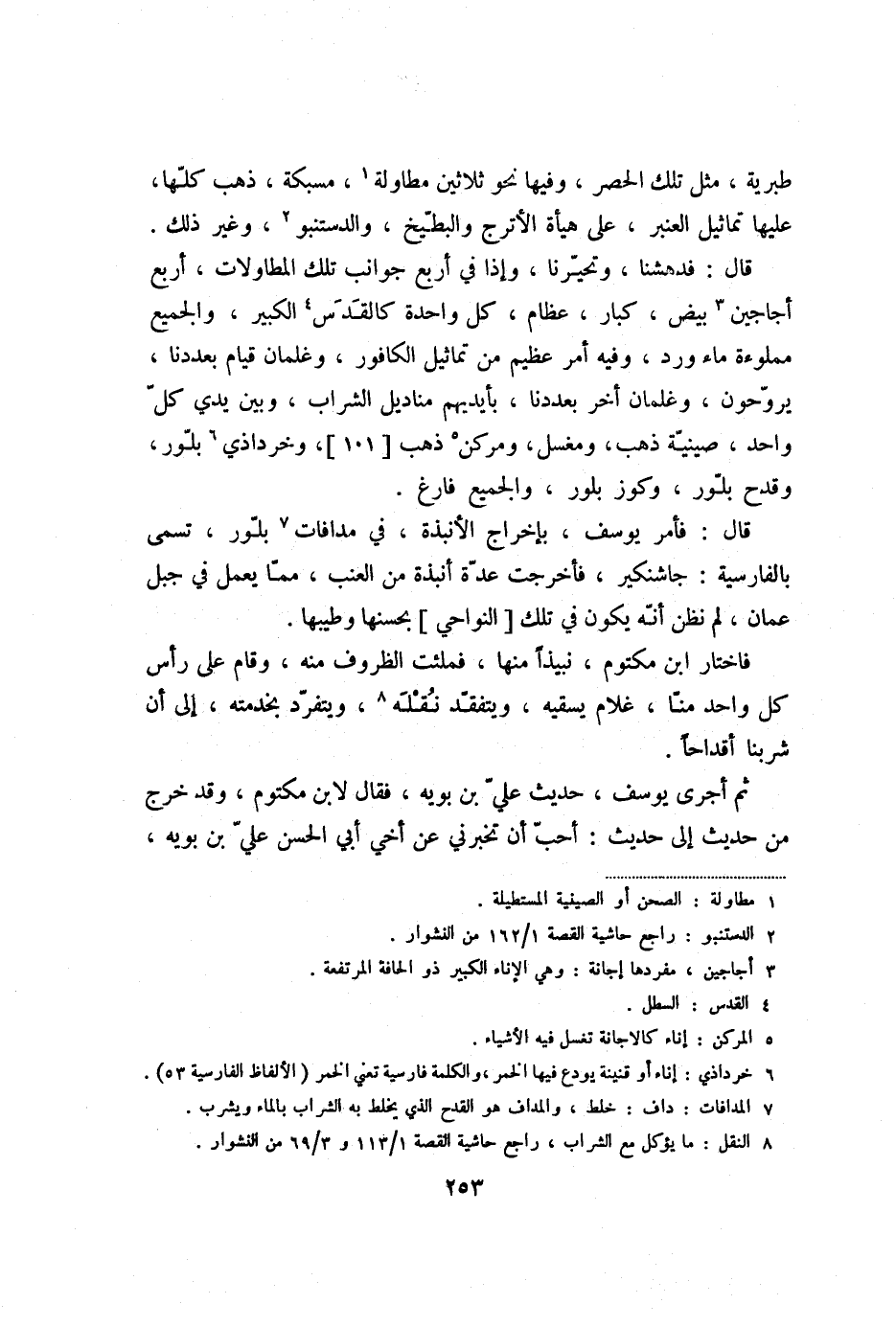 قال: فأمر يوسف، بإخراج الأنبذة، في مدافات «7» بلّور، تسمى بالفارسية: جاشنكير، فأخرجت عدّة أنبذة من العنب، ممّا يعمل في جبل عمان، لم نظن أنّه يكون في تلك [النواحي] بحسنها وطيبها.