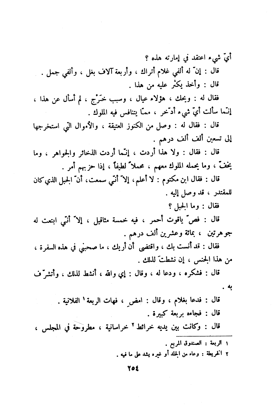 قال: فقال: ولا هذا أردت، إنّما أردت الذخائر والجواهر، وما يخفّ، وما يحمله الملوك معهم، محملا لطيفا، إذا حزبهم أمر.