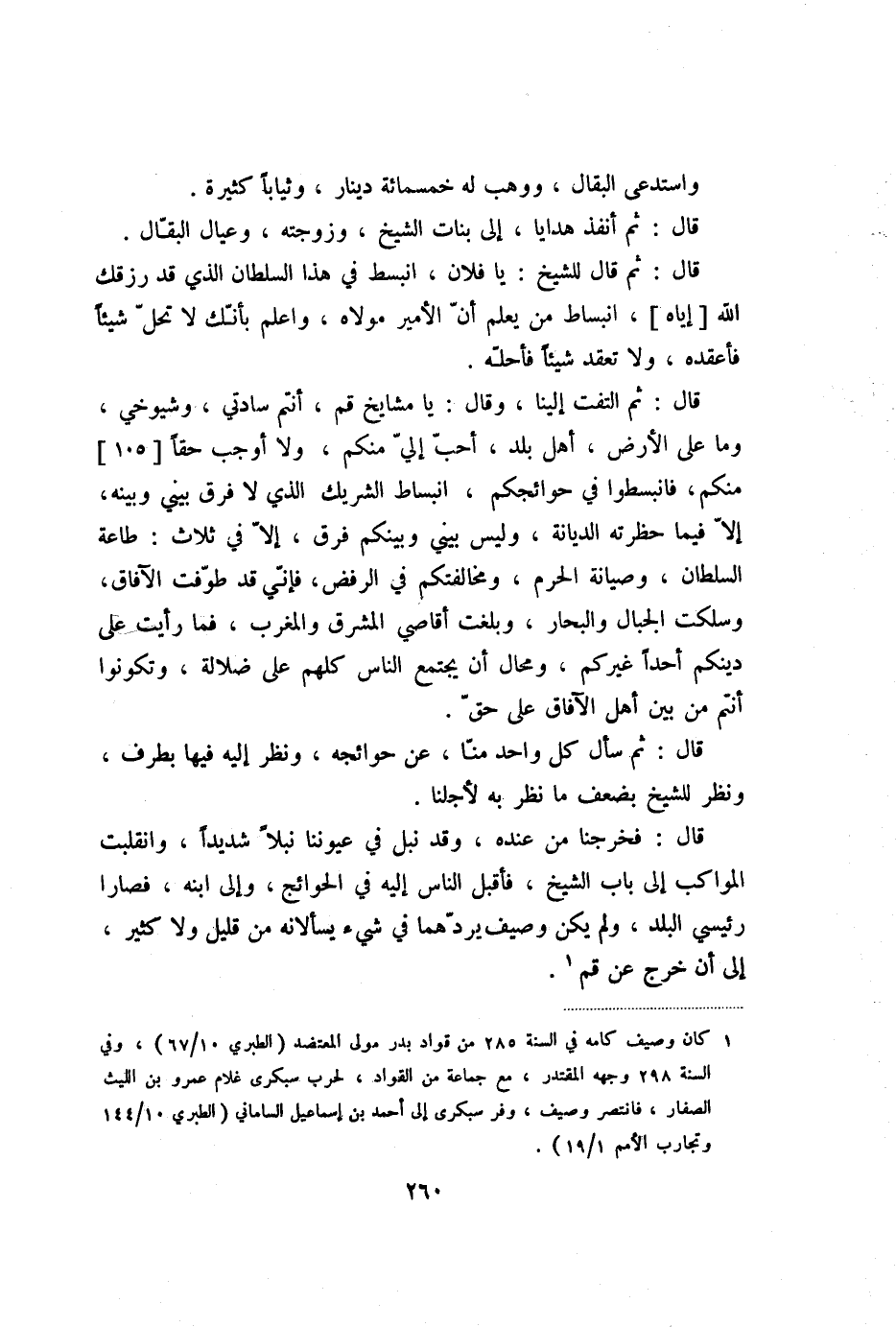 قال: ثم التفت إلينا، وقال: يا مشايخ قم، أنتم سادتي، وشيوخي، وما على الأرض، أهل بلد، أحبّ إليّ منكم، ولا أوجب حقا [105] منكم، فانبسطوا في حوائجكم، انبساط الشريك الذي لا فرق بيني وبينه، إلّا فيما حظرته الديانة، وليس بيني وبينكم فرق، إلّا في ثلاث: طاعة السلطان، وصيانة الحرم، ومخالفتكم في الرفض، فإنّي قد طوّفت الآفاق، وسلكت الجبال والبحار، وبلغت أقاصي المشرق والمغرب، فما رأيت على دينكم أحدا غيركم، ومحال أن يجتمع الناس كلهم على ضلالة، وتكونوا أنتم من بين أهل الآفاق على حقّ.