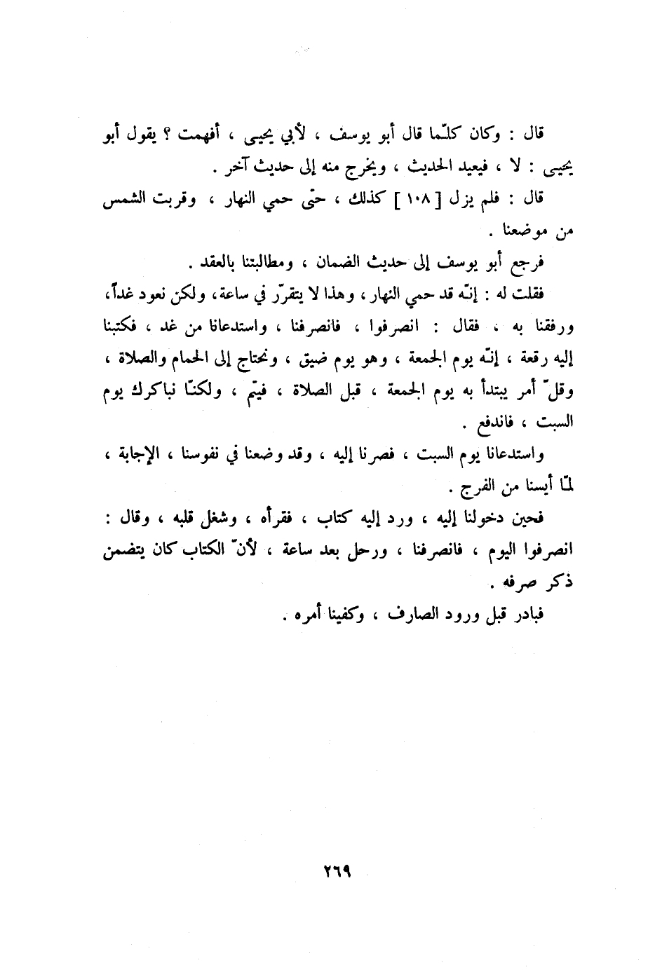فقلت له: إنّه قد حمي النهار، وهذا لا يتقرّر في ساعة، ولكن نعود غدا، ورفقنا به، فقال: انصرفوا، فانصرفنا، واستدعانا من غد، فكتبنا إليه رقعة، إنّه يوم الجمعة، وهو يوم ضيق، ونحتاج إلى الحمام والصلاة، وقلّ أمر يبتدأ به يوم الجمعة، قبل الصلاة، فيتم، ولكنّا نباكرك يوم السبت، فاندفع.