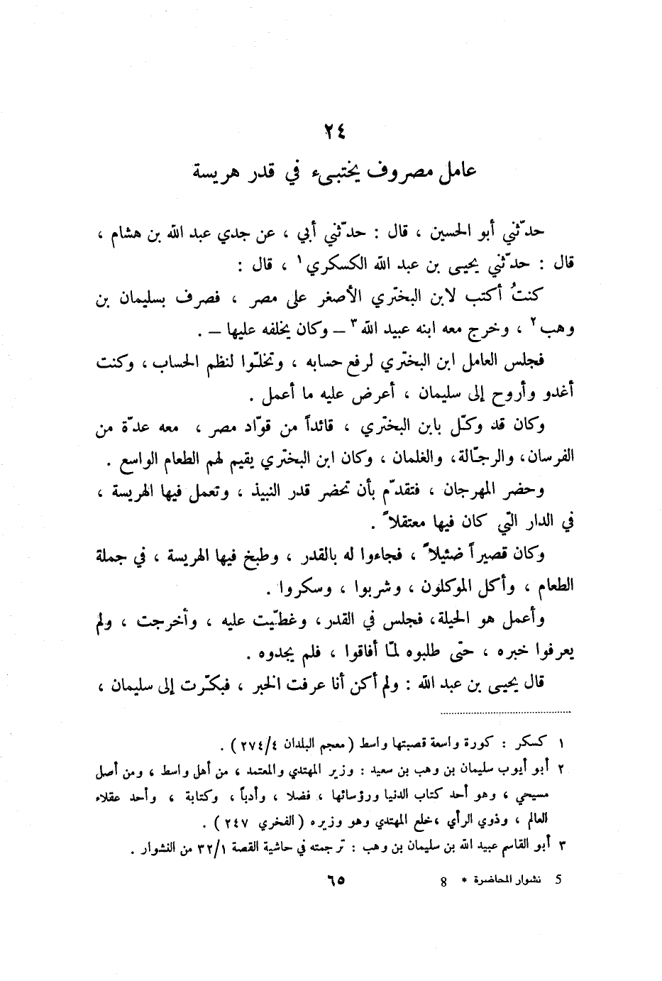 فجلس العامل ابن البختري لرفع حسابه، وتخلّوا لنظم الحساب، وكنت أغدو وأروح إلى سليمان، أعرض عليه ما أعمل.