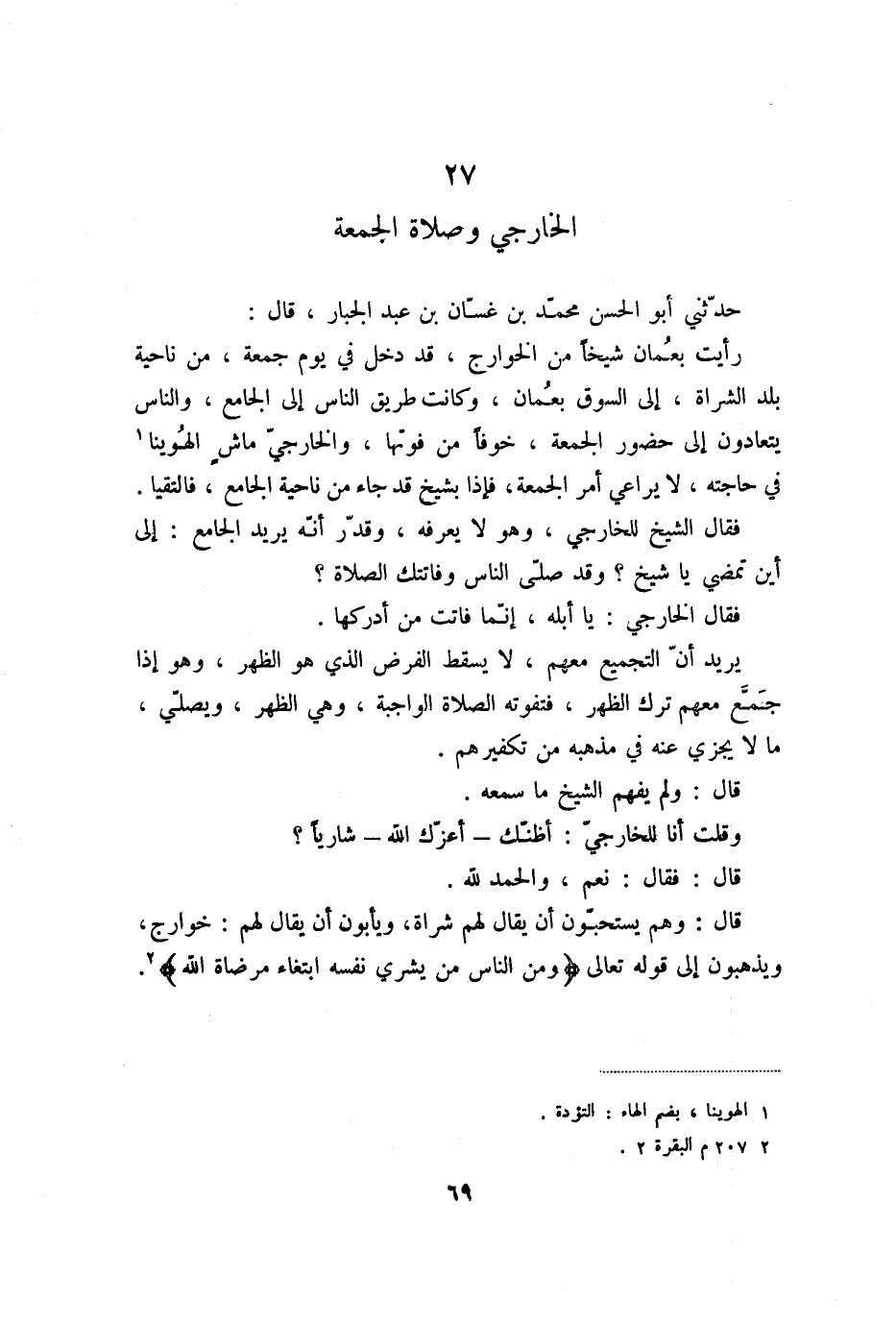 رأيت بعمان شيخا من الخوارج، قد دخل في يوم جمعة، من ناحية بلد الشراة، إلى السوق بعمان، وكانت طريق الناس إلى الجامع، والناس يتعادون إلى حضور الجمعة، خوفا من فوتها، والخارجيّ ماش الهوينا «1» في حاجته، لا يراعي أمر الجمعة، فإذا بشيخ قد جاء من ناحية الجامع، فالتقيا.