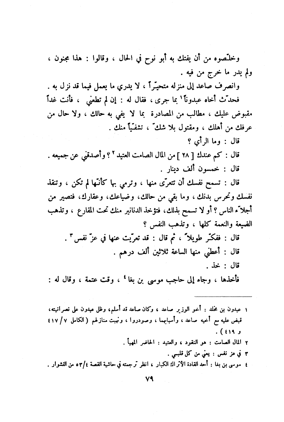 قال: تسمح نفسك أن تتعرّى منها، وترمي بها كأنّها لم تكن، وتنقذ نفسك وتحرس بدنك، وما بقي من حالك، وضياعك، وعقارك، فتصير من أجلّاء الناس؟ أو لا تسمح بذلك، فتؤخذ الدنانير منك تحت المقارع، وتذهب الضيعة والنعمة كلها، وتذهب النفس؟