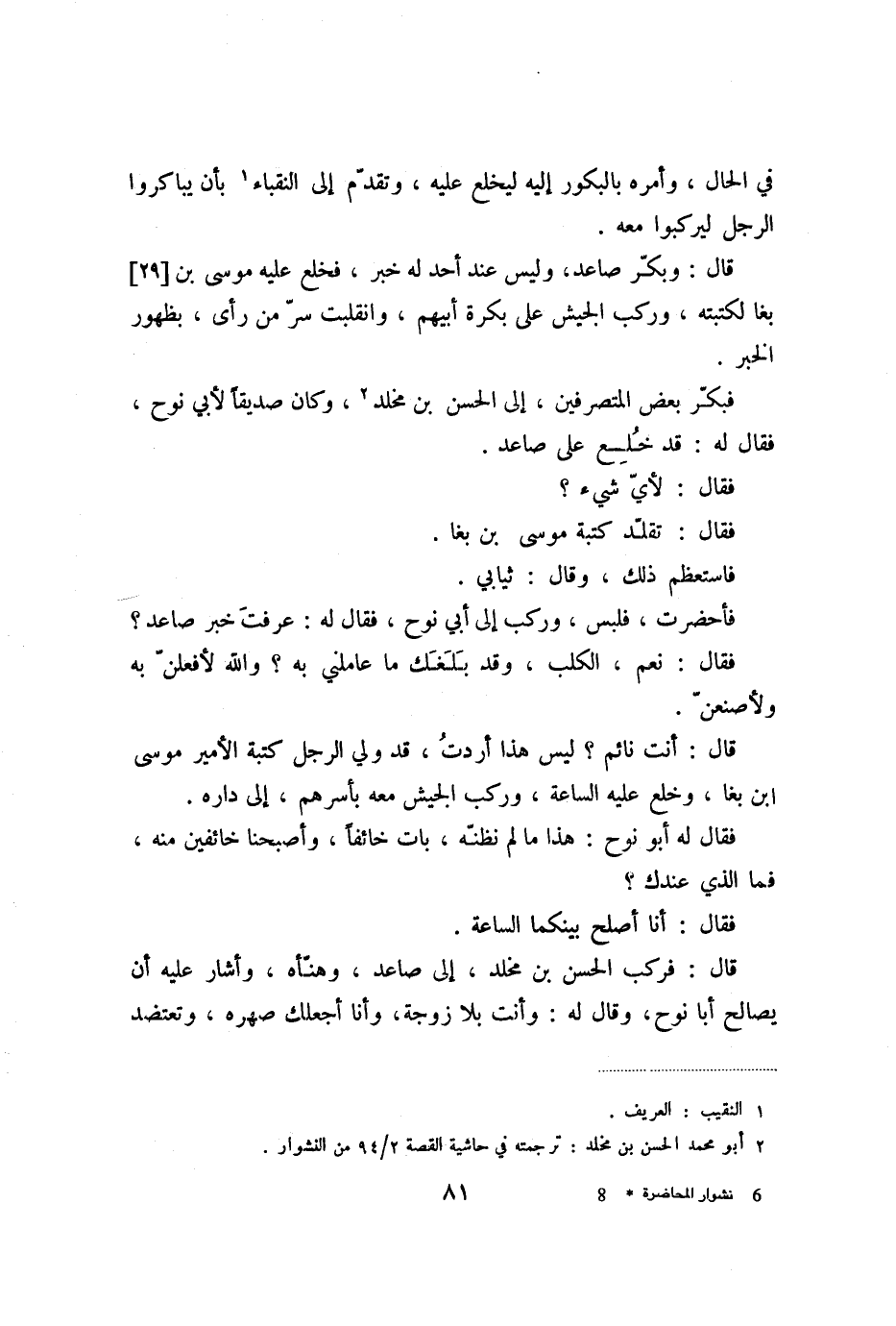 قال: أنت نائم؟ ليس هذا أردت، قد ولي الرجل كتبة الأمير موسى ابن بغا، وخلع عليه الساعة، وركب الجيش معه بأسرهم، إلى داره.