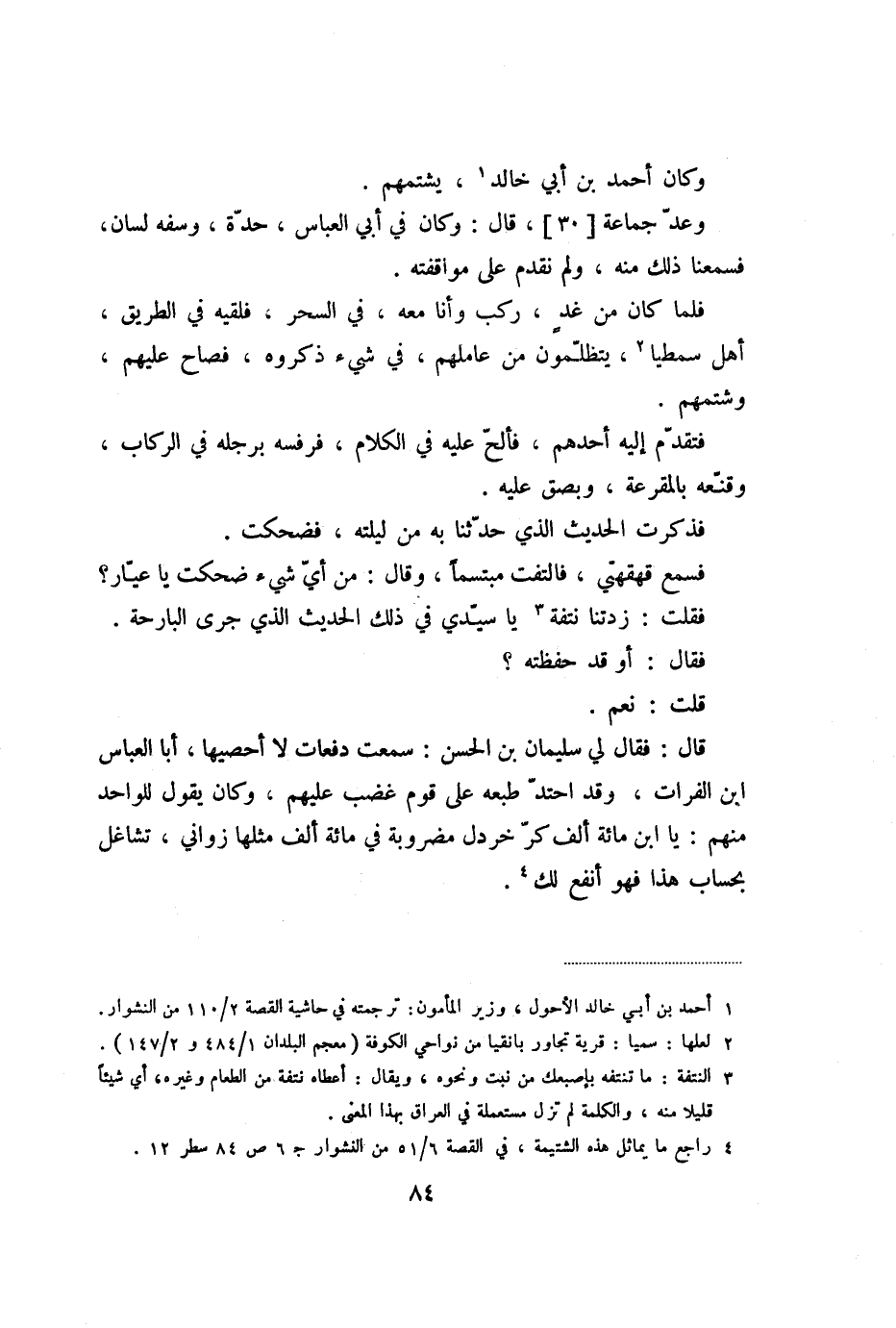 قال: فقال لي سليمان بن الحسن: سمعت دفعات لا أحصيها، أبا العباس ابن الفرات، وقد احتدّ طبعه على قوم غضب عليهم، وكان يقول للواحد منهم: يا ابن مائة ألف كرّ خردل مضروبة في مائة ألف مثلها زواني، تشاغل بحساب هذا فهو أنفع لك «4» .