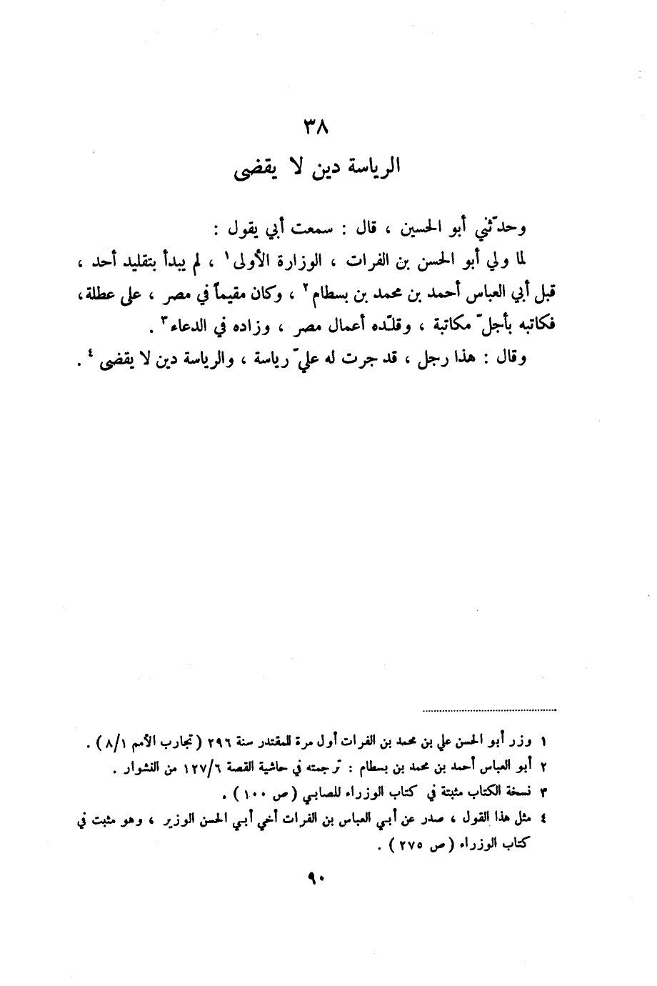 لما ولي أبو الحسن بن الفرات، الوزارة الأولى «1» ، لم يبدأ بتقليد أحد، قبل أبي العباس أحمد بن محمد بن بسطام «2» ، وكان مقيما في مصر، على عطلة، فكاتبه بأجلّ مكاتبة، وقلّده أعمال مصر، وزاده في الدعاء «3» .