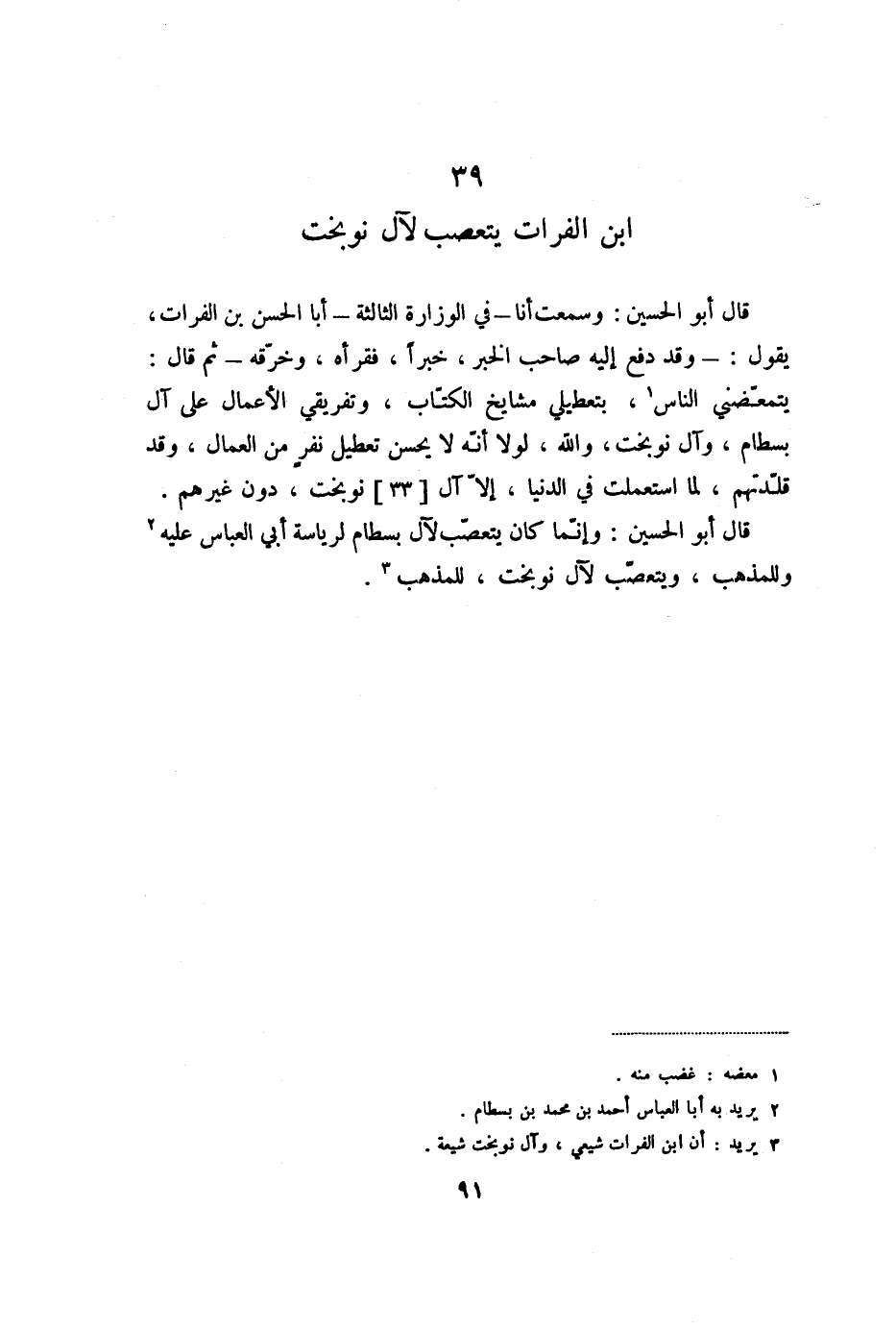 قال أبو الحسين: وإنّما كان يتعصّب لآل بسطام لرياسة أبي العباس عليه «2» وللمذهب، ويتعصّب لآل نوبخت، للمذهب «3» .