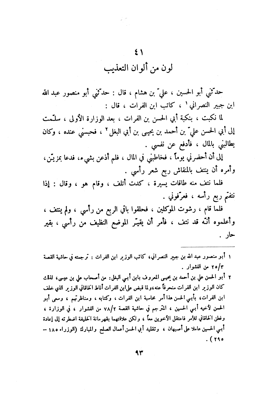 إلى أن أحضرني يوما، فخاطبني في المال، فلم أذغن بشيء، فدعا بمزيّن، وأمره أن ينتف بالمنقاش ربع شعر رأسي.