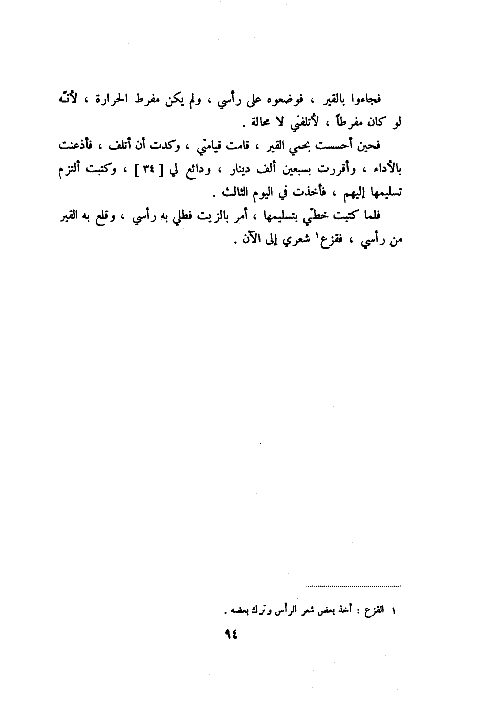 فلما كتبت خطّي بتسليمها، أمر بالزيت فطلي به رأسي، وقلع به القير من رأسي، فقزع «1» شعري إلى الآن.