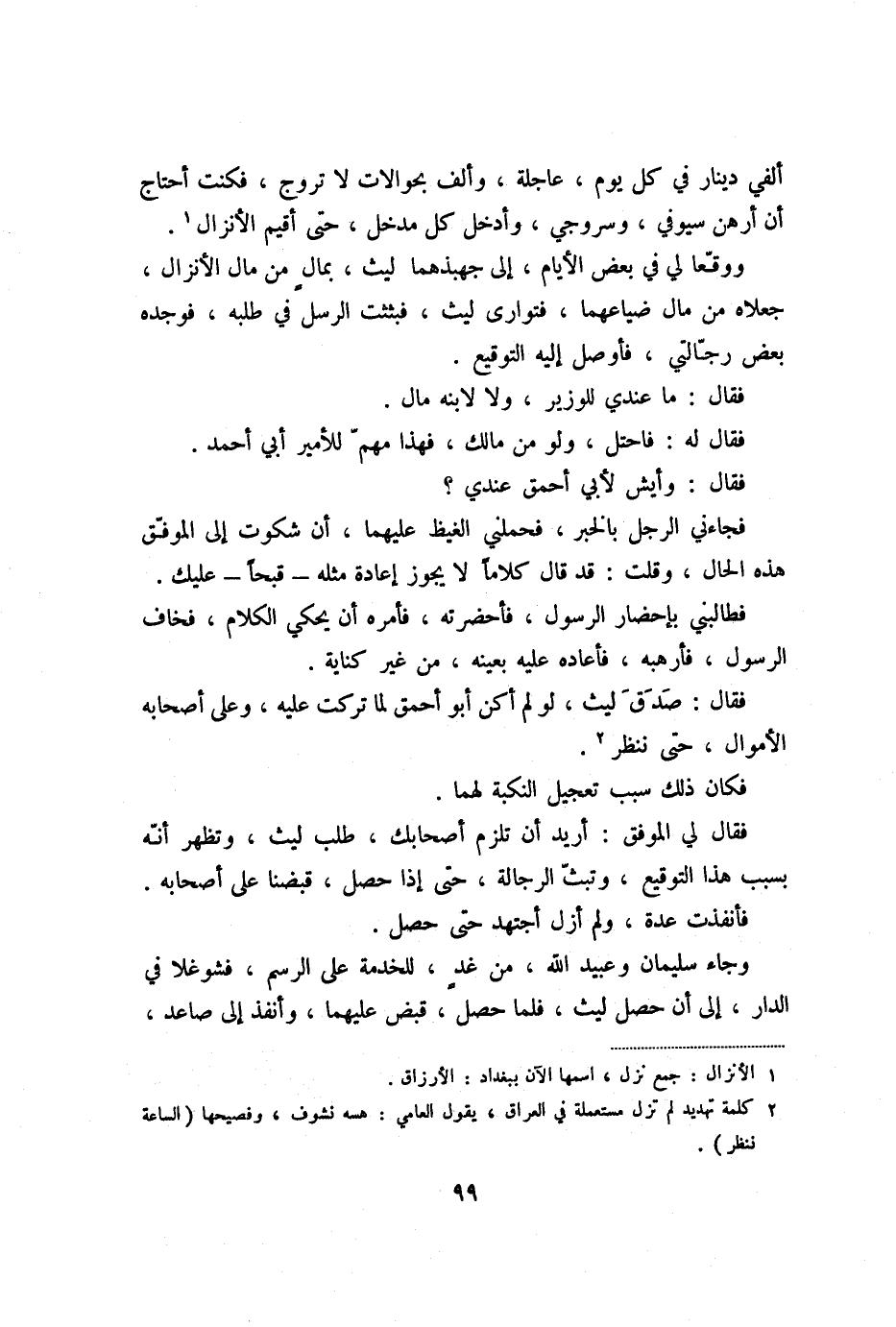 ووقّعا لي في بعض الأيام، إلى جهبذهما ليث، بمال من مال الأنزال، جعلاه من مال ضياعهما، فتوارى ليث، فبثثت الرسل في طلبه، فوجده بعض رجّالتي، فأوصل إليه التوقيع.