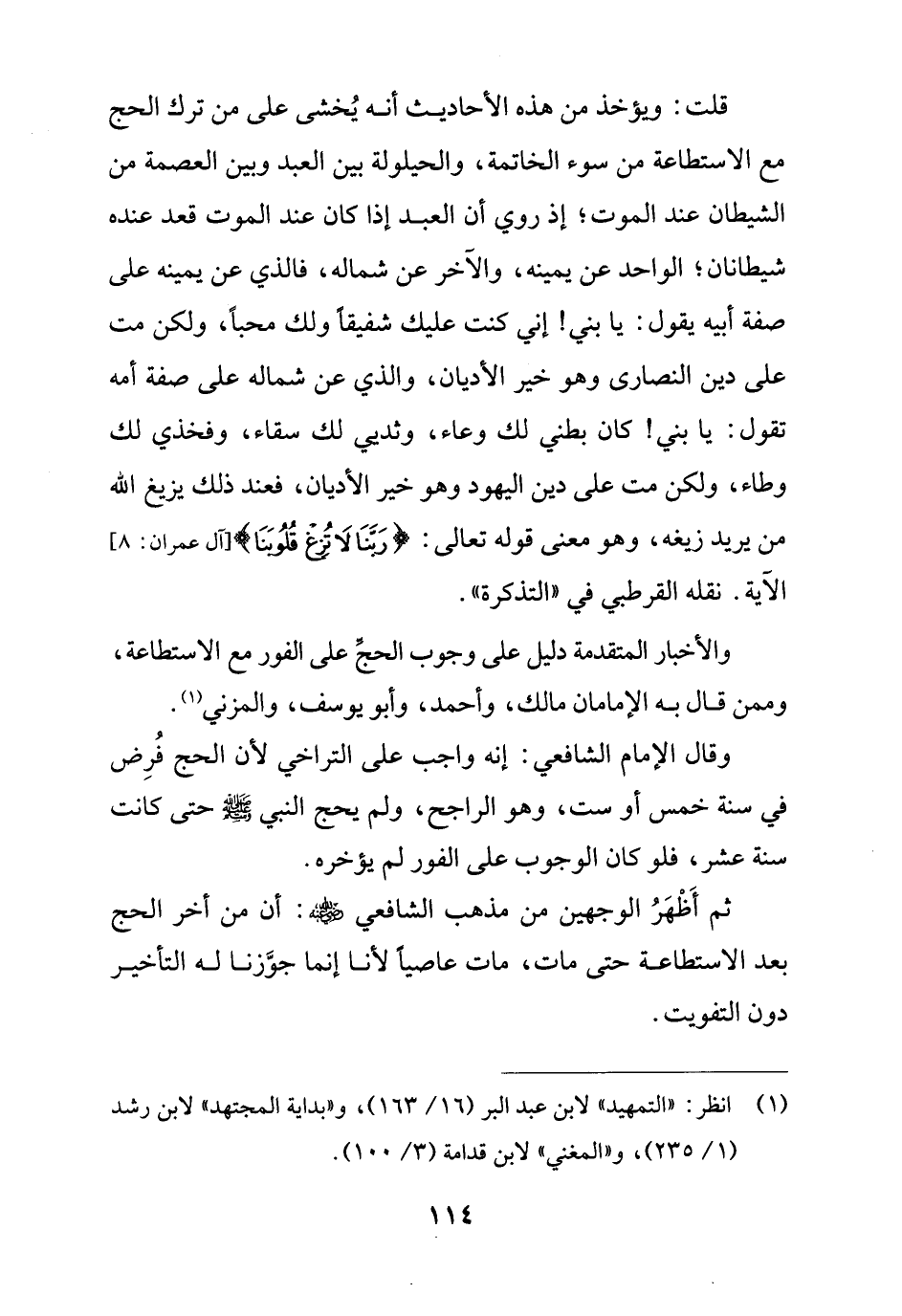 قلت: ويؤخذ من هذه الأحاديث أنَّه يُخشى على من ترك الحج مع الاستطاعة من سوء الخاتمة، والحيلولة بين العبد وبين العصمة من الشيطان عند الموت؛ إذ روي أن العبد إذا كان عند الموت قعد عنده شيطانان؛ الواحد عن يمينه، والآخر عن شماله، فالذي عن يمينه على صفة أبيه يقول: يا بني! إني كنت عليك شفيقًا ولك محبًا، ولكن مت على دين النصارى وهو خير الأديان، والذي عن شماله على صفة أمه تقول: يا بني! كان بطني لك وعاء، وثدي لك سقاء، وفخذي لك وطاء، ولكن مت على دين اليهود وهو خير الأديان، فعند ذلك يزيغ الله من يريد زيغه، وهو معنى قوله تعالى: {رَبَّنَا لَا تُزِغْ قُلُوبَنَا} [آل عمران: 8] الآية. نقله القرطبي في "التذكرة".