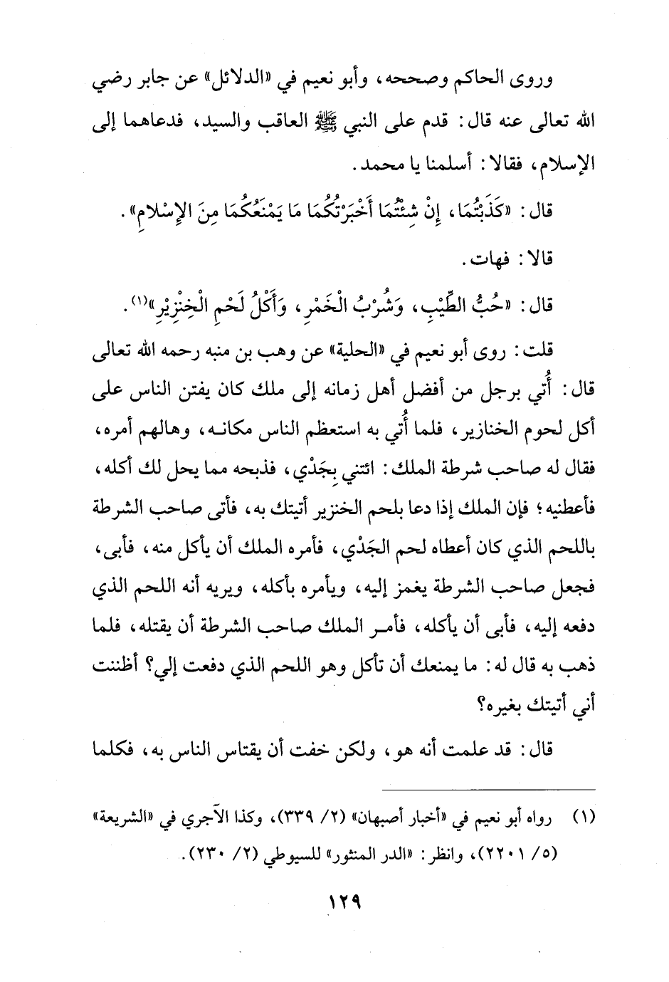 قلت: روى أبو نعيم في "الحلية" عن وهب بن منبه رحمه الله تعالى قال: أُتي برجل من أفضل أهل زمانه إلى ملك كان يفتن الناس على أكل لحوم الخنازير، فلما أُتي به استعظم الناس مكانه، وهالهم أمره، فقال له صاحب شرطة الملك: ائتني بِجَدْي، فذبحه مما يحل لك أكله، فأعطنيه؛ فإن الملك إذا دعا بلحم الخنزير أتيتك به، فأتى صاحب الشرطة باللحم الذي كان أعطاه لحم الجَدْي، فأمره الملك أن يأكل منه، فأبى، فجعل صاحب الشرطة يغمز إليه، ويأمره بأكله، ويريه أنَّه اللحم الذي دفعه إليه، فأبى أن يأكله، فأمر الملك صاحب الشرطة أن يقتله، فلما ذهب به قال له: ما يمنعك أن تأكل وهو اللحم الذي دفعت إلي؟ أظننت أني أتيتك بغيره؟