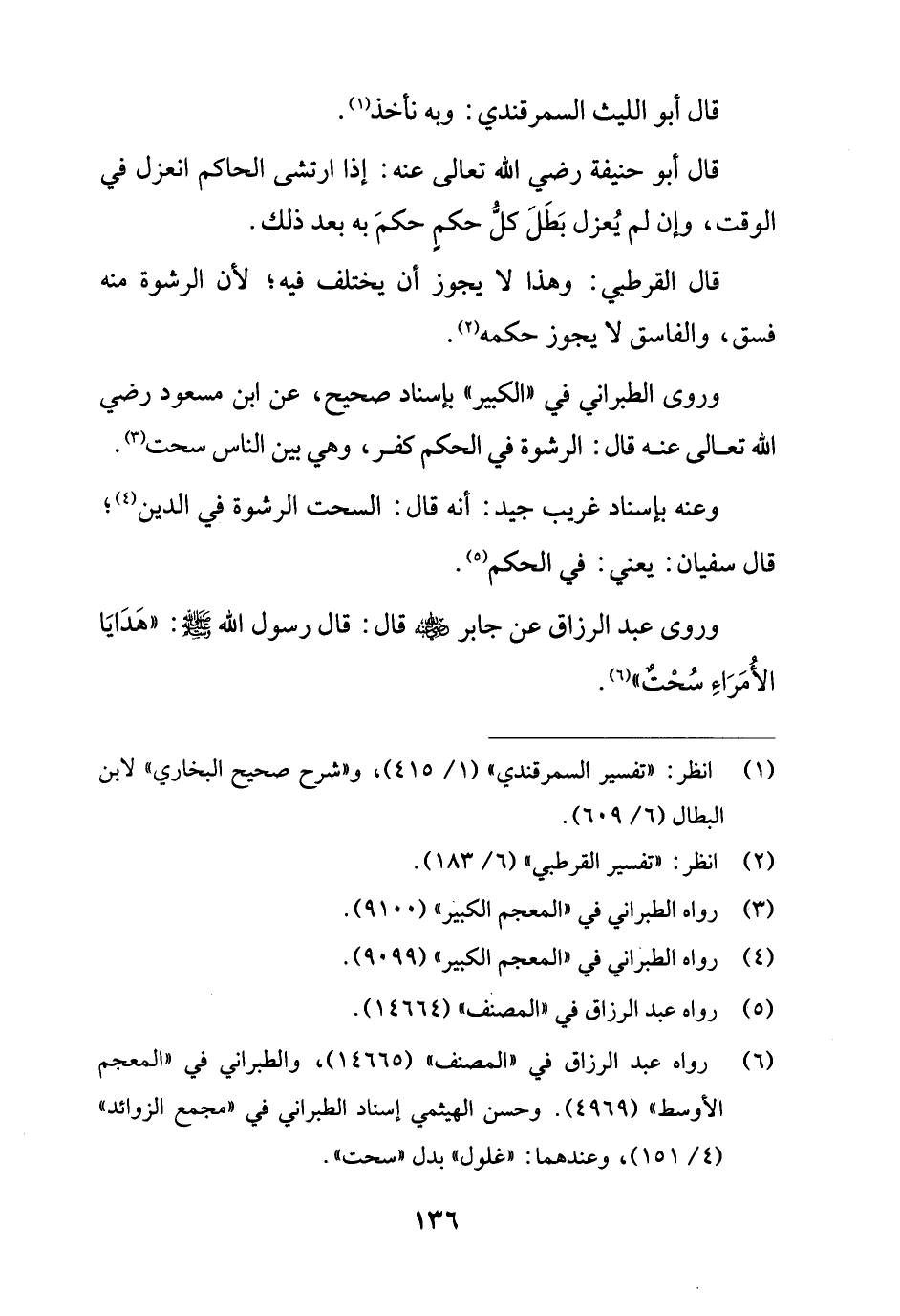 وروى الطبراني في "الكبير" بإسناد صحيح، عن ابن مسعود رضي الله تعالى عنه قال: الرشوة في الحكم كفر، وهي بين الناس سحت (¬3).