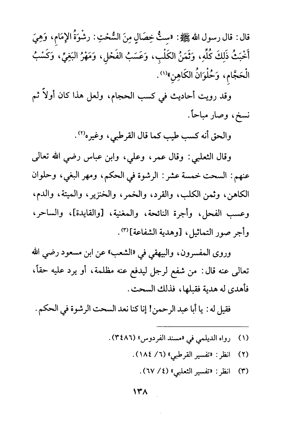 قال: قال رسول الله -صلى الله عليه وسلم-: "سِتُّ خِصالٍ مِنَ السُّحْتِ: رشْوَةُ الإِمامِ، وَهِيَ أَخْبَثُ ذَلِكَ كُلِّهِ، وَثَمَنُ الكَلْبِ، وَعَسَبُ الفَحْلِ، وَمَهْرُ البَغِيِّ، وَكَسْبُ الْحَجَّامِ، وَحُلْوَانُ الكاهِنِ" (¬1).