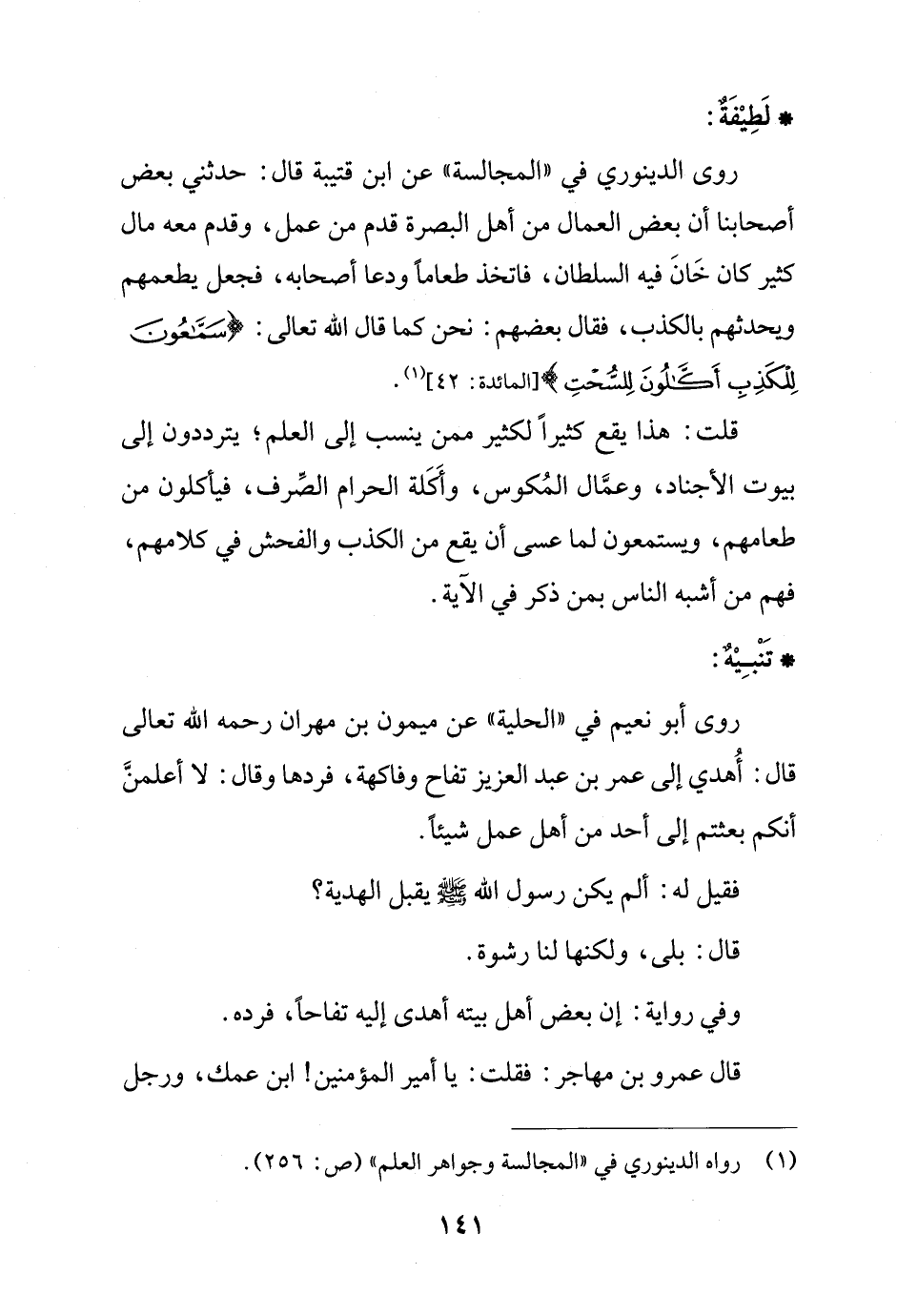 روى الدينوري في "المجالسة" عن ابن قتيبة قال: حدثني بعض أصحابنا أن بعض العمال من أهل البصرة قدم من عمل، وقدم معه مال كثير كان خَانَ فيه السلطان، فاتخذ طعامًا ودعا أصحابه، فجعل يطعمهم ويحدثهم بالكذب، فقال بعضهم: نحن كما قال الله تعالى: {سَمَّاعُونَ لِلْكَذِبِ أَكَّالُونَ لِلسُّحْتِ} [المائدة: 42] (¬1).