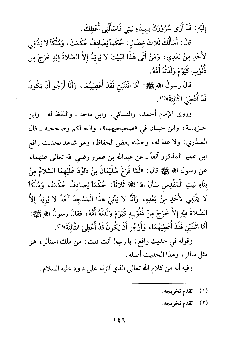 وروى الإمام أحمد، والنسائي، وابن ماجه -واللفظ له- وابن خزيمة، وابن حبَّان في "صحيحيهما"، والحاكم وصححه -قال المنذري: ولا علة له، وحسَّنه بعض الحفاظ، وهو شاهد لحديث رافع ابن عمير المذكور آنفًا- عن عبد الله بن عمرو رضي الله تعالى عنهما، عن رسول الله -صلى الله عليه وسلم- قال: "لَمَّا فَرَغَ سُلَيْمانُ بنُ دَاوُدَ عَلَيْهِما السَّلامُ مِنْ بِناءِ بَيْتِ الْمَقْدِسِ سَألَ اللهَ -عز وجل- ثَلاثًا: حُكْمًا يُصادِفُ حُكْمَهُ، وَمُلْكًا لا يَنْبَغِي لأَحَدٍ مِنْ بَعْدِهِ، وَأَنَّه لا يَأتِيَ هَذا الْمَسْجِدَ أَحَدٌ لا يُرِيْدُ إِلَّا الصَّلاةَ فِيْهِ إِلَّا خَرَجَ مِنْ ذُنُوْبِهِ كَيَوْمَ وَلَدَتْهُ أُمُّهُ، فقالَ رسولُ اللهِ - صلى الله عليه وسلم -: أَمَّا اثْنتَيْنِ فَقَدْ أُعْطِيَهُما، وَأَرْجُو أَنْ يَكُونَ قَدْ أُعْطِيَ الثَّالِثَةَ" (¬2).