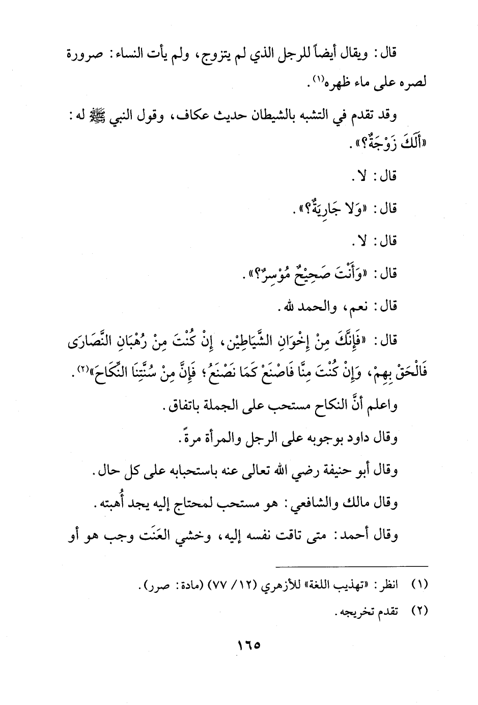 قال: "فَإِنَّكَ مِنْ إِخْوَانِ الشَّيَاطِيْن، إِنْ كُنْتَ مِنْ رُهْبَانِ النَّصَارَى فَالْحَقْ بِهِمْ، وَإِنْ كُنْتَ مِنَّا فَاصْنَعْ كَمَا نَصْنعُ؛ فَإِنَّ مِنْ سُنَّتِنَا النِّكَاحَ" (¬2).