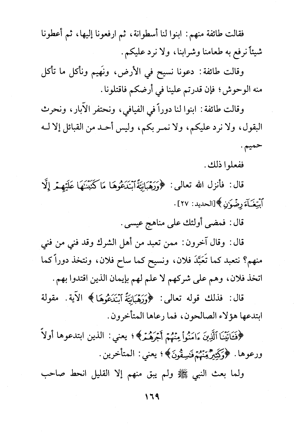 قال: فذلك قوله تعالى: {وَرَهْبَانِيَّةً ابْتَدَعُوهَا} الآية. مقولة ابتدعها هؤلاء الصالحون، فما رعاها المتأخرون.
