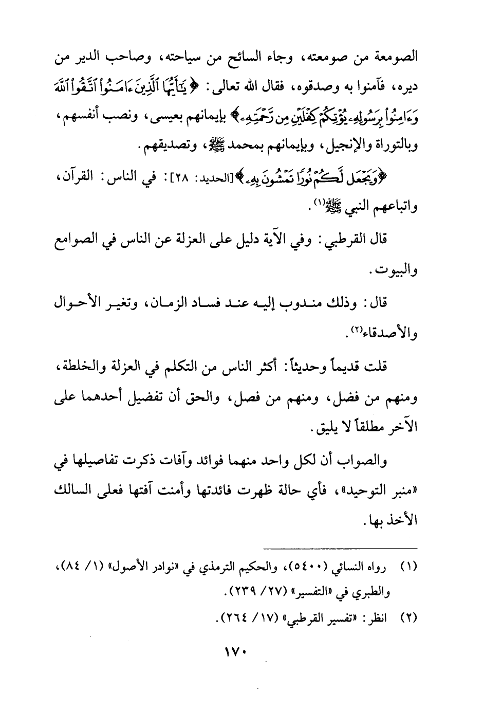 قلت قديماً وحديثاً: أكثر الناس من التكلم في العزلة والخلطة، ومنهم من فضل، ومنهم من فصل، والحق أن تفضيل أحدهما على الآخر مطلقاً لا يليق.