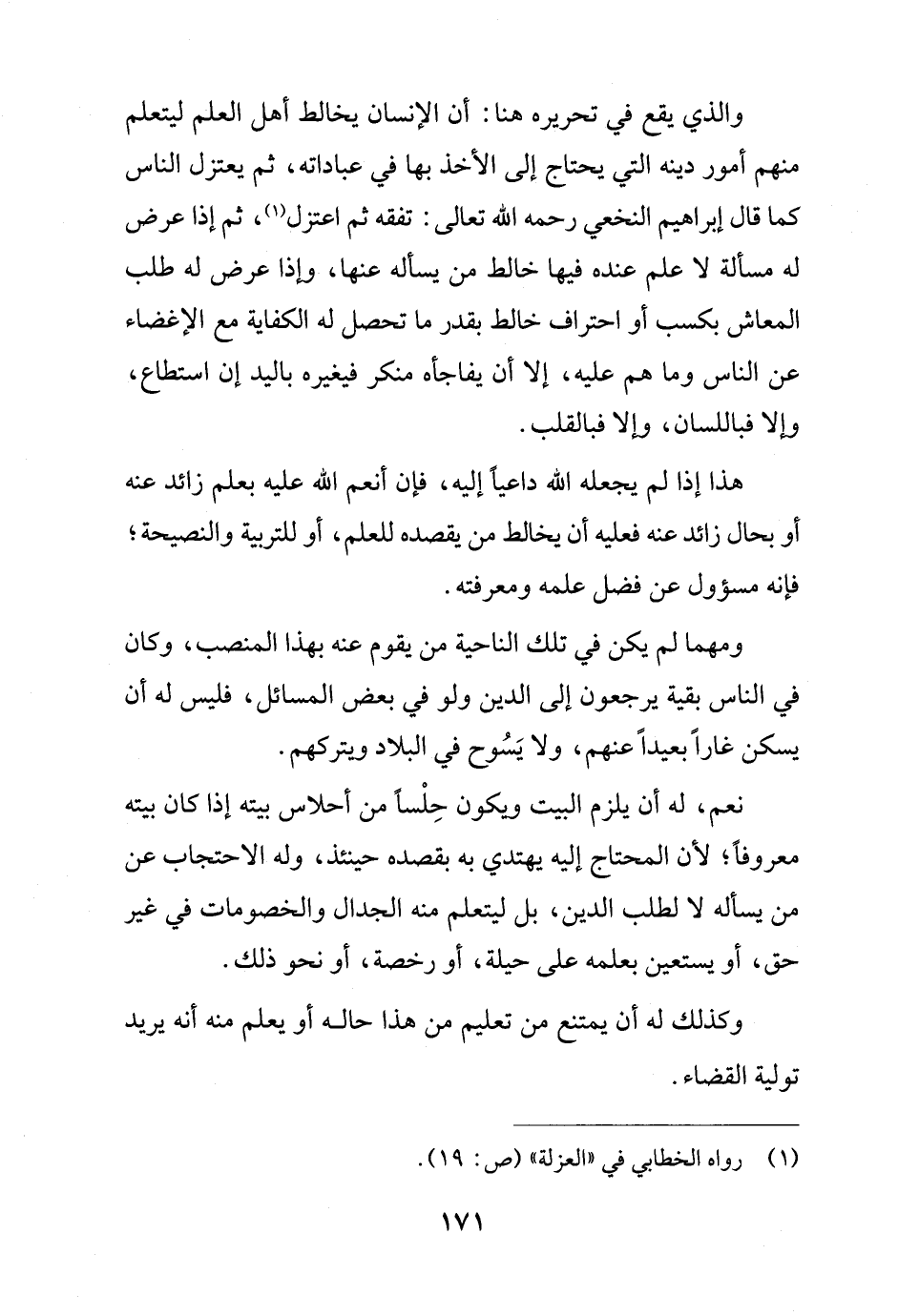 ومهما لم يكن في تلك الناحية من يقوم عنه بهذا المنصب، وكان في الناس بقية يرجعون إلى الدين ولو في بعض المسائل، فليس له أن يسكن غاراً بعيداً عنهم، ولا يَسُوح في البلاد ويتركهم.