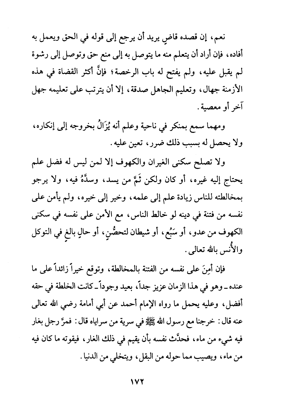 ولا تصلح سكنى الغيران والكهوف إلا لمن ليس له فضل علم يحتاج إليه غيره، أو كان ولكن ثَمَّ من يسد، وسدَّهُ فيه، ولا يرجو بمخالطته للناس زيادة علم إلى علمه، وخير إلى خيره، ولم يأمن على نفسه من فتنة في دينه لو خالط الناس، مع الأمن على نفسه في سكنى الكهوف من عدو، أو سَبُع، أو شيطان لتحصُّنٍ، أو حالٍ بالغٍ في التوكل والأُنس بالله تعالى.