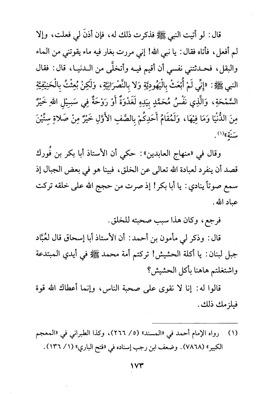 قال: لو أتيت النبي - صلى الله عليه وسلم - فذكرت ذلك له، فإن أذنَ لي فعلت، وإلا لم أفعل، فأتاه فقال: يا نبي الله! إني مررت بغار فيه ماء يقوتني من الماء والبقل، فحدثتني نفسي أن أقيم فيه وأتخلَّى من الدنيا، قال: فقال النبي - صلى الله عليه وسلم -: "إِنِّي لَمْ أُبْعَثْ بِالْيَهُودِيَّةِ وَلا بِالنَّصْرَانِيَّةِ، وَلَكِنْ بُعِثْتُ بِالْحَنِيْفِيَّةِ السَّمْحَةِ، وَالَّذِي نَفْسُ مُحَمَّدٍ بِيَدِهِ لَغَدْوَةٌ أَوْ رَوْحَةٌ فِي سَبِيْلِ اللهِ خَيْرٌ مِنَ الدُّنْيَا وَمَا فِيْهَا، وَلَمُقَامُ أَحَدِكُمْ بِالصَّفِ الأَوَّلِ خَيْرٌ مِنْ صَلاةِ سِتِّيْنَ سَنَةٍ" (¬1).