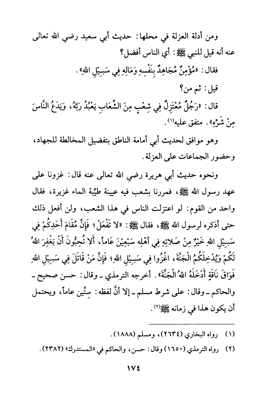 ومن أدلة العزلة في محلها: حديث أبي سعيد رضي الله تعالى عنه أنه قيل للنبي - صلى الله عليه وسلم -: أي الناس أفضل؟