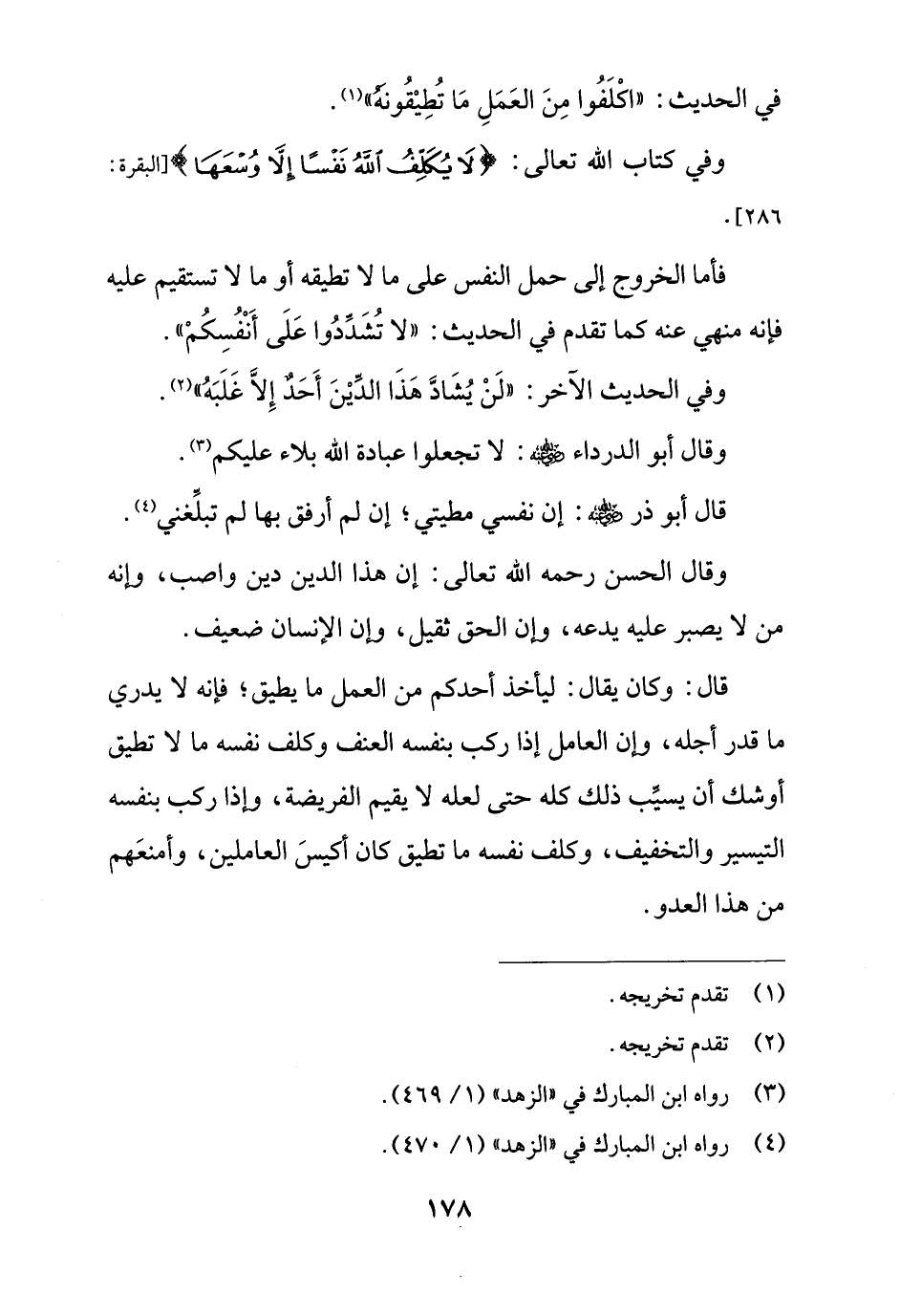 قال: وكان يقال: ليأخذ أحدكم من العمل ما يطيق؛ فإنه لا يدري ما قدر أجله، وإن العامل إذا ركب بنفسه العنف وكلف نفسه ما لا تطيق أوشك أن يسيِّب ذلك كله حتى لعله لا يقيم الفريضة، وإذا ركب بنفسه التيسير والتخفيف، وكلف نفسه ما تطيق كان أكيسَ العاملين، وأمنعَهم من هذا العدو.