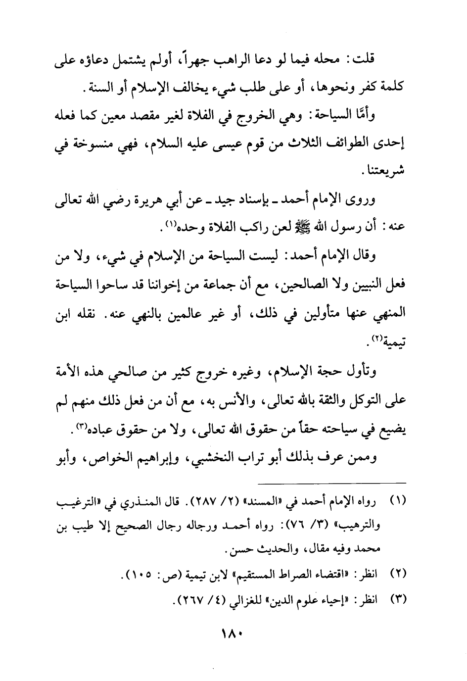 وقال الإمام أحمد: ليست السياحة من الإسلام في شيء، ولا من فعل النبيين ولا الصالحين، مع أن جماعة من إخواننا قد ساحوا السياحة المنهي عنها متأولين في ذلك، أو غير عالمين بالنهي عنه. نقله ابن تيمية (¬2).