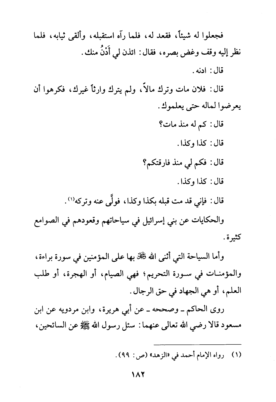 روى الحاكم - وصححه - عن أبي هريرة، وابن مردويه عن ابن مسعود قالا رضي الله تعالى عنهما: سئل رسول الله - صلى الله عليه وسلم - عن السائحين،