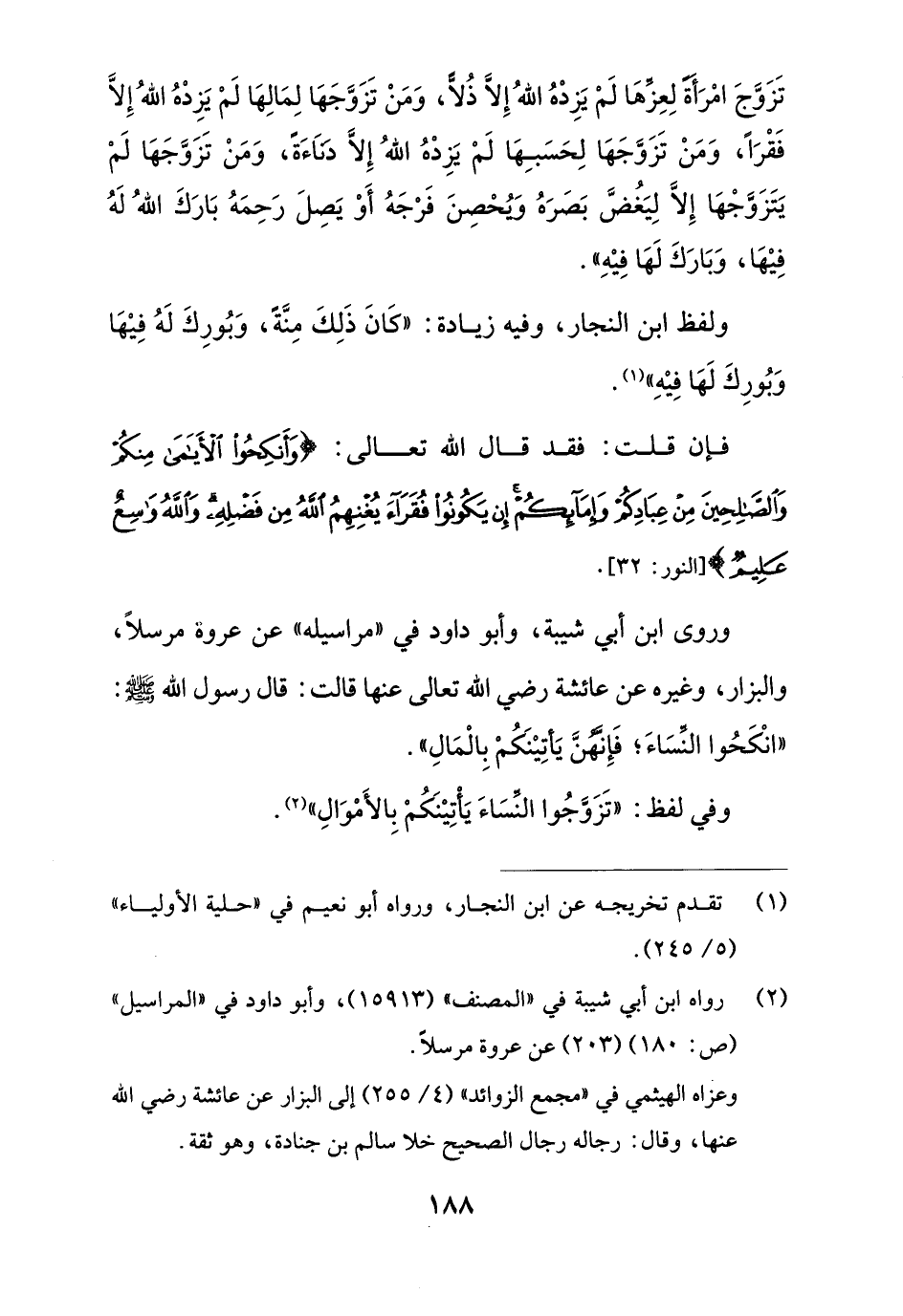 تَزَوَّجَ امْرَأة لِعِزِّها لَمْ يَزِدْهُ اللهُ إِلاَّ ذُلاًّ، وَمَنْ تَزَوَّجَهَا لِمَالِهَا لَمْ يَزِدْهُ اللهُ إِلاَّ فَقْرًا، وَمَنْ تَزَوَّجَهَا لِحَسَبِهَا لَمْ يَزِدْهُ اللهُ إِلاَّ دنَاءَةً، وَمَنْ تَزَوَّجَهَا لَمْ يَتَزَوَّجْهَا إِلاَّ ليَغُضَّ بَصَرَهُ وَيُحْصِنَ فَرْجَهُ أَوْ يَصِلَ رَحِمَهُ بَارَكَ اللهُ لَهُ فِيْهَا، وَبَارَكَ لَهَا فِيْهِ".