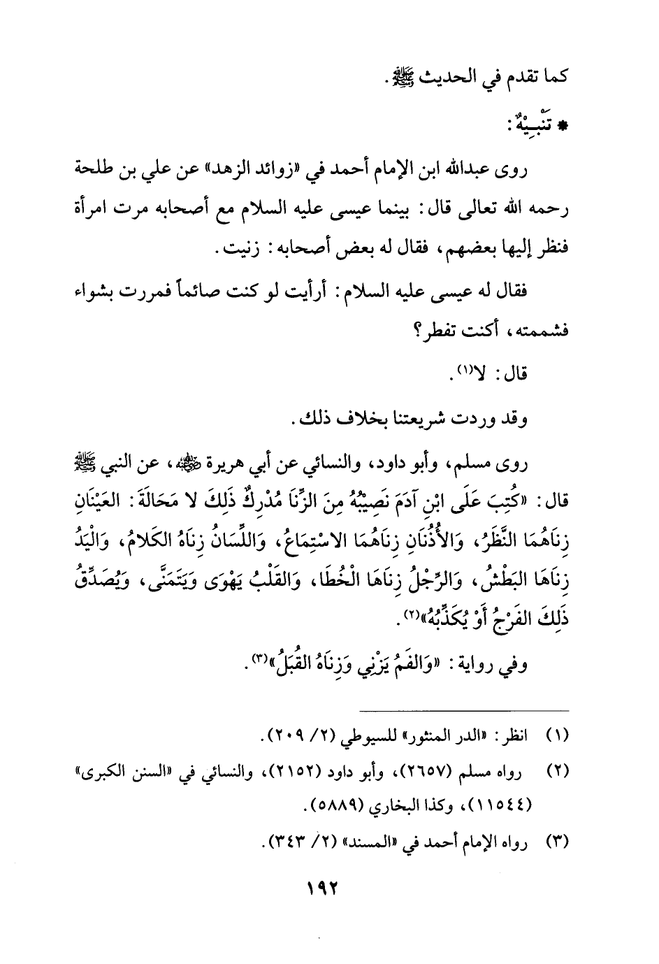 روى عبد الله ابن الإمام أحمد في "زوائد الزهد" عن علي بن طلحة رحمه الله تعالى قال: بينما عيسى عليه السلام مع أصحابه مرت امرأة فنظر إليها بعضهم، فقال له بعض أصحابه: زنيت.