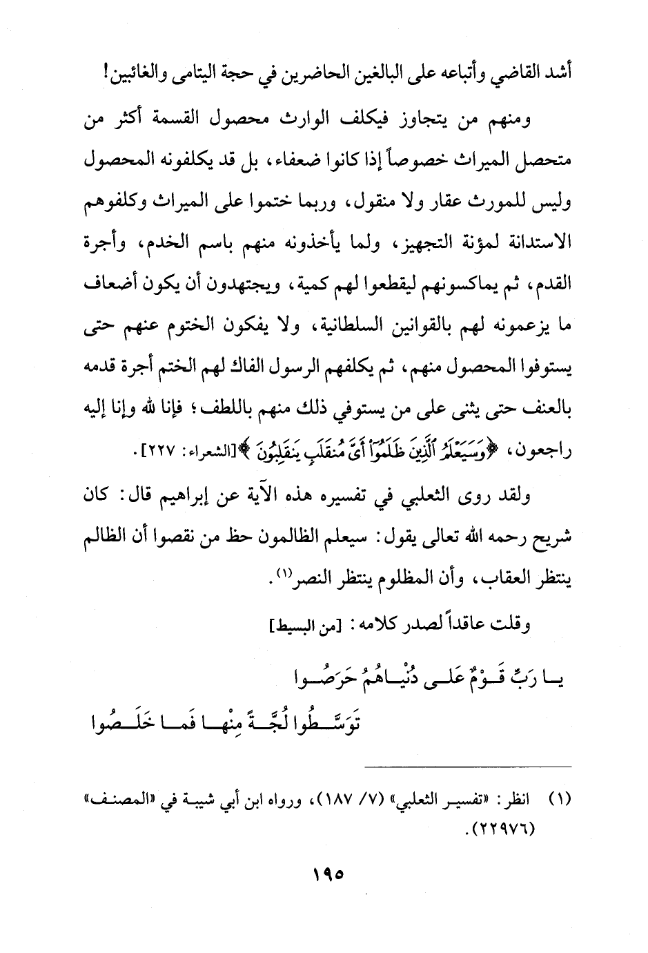 ولقد روى الثعلبي في تفسيره هذه الآية عن إبراهيم قال: كان شريح رحمه الله تعالى يقول: سيعلم الظالمون حظ من نقصوا أن الظالم ينتظر العقاب، وأن المظلوم ينتظر النصر (¬1).