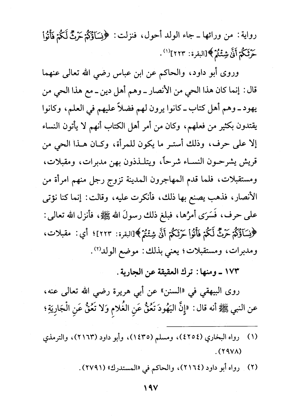 وروى أبو داود، والحاكم عن ابن عباس رضي الله تعالى عنهما قال: إنما كان هذا الحي من الأنصار - وهم أهل دين - مع هذا الحي من يهود - وهم أهل كتاب - كانوا يرون لهم فضلاً عليهم في العلم، وكانوا يقتدون بكثير من فعلهم، وكان من أمر أهل الكتاب أنهم لا يأتون النساء إلا على حرف، وذلك أستر ما يكون للمرأة، وكان هذا الحي من قريش يشرحون النساء شرحاً، ويتلذذون بهن مدبرات، ومقبلات، ومستقبلات، فلما قدم المهاجرون المدينة تزوج رجل منهم امرأة من الأنصار، فذهب يصنع بها ذلك، فأنكرت عليه، وقالت: إنما كنا نؤتى على حرف، فَسَرَى أمرُها، فبلغ ذلك رسولَ الله - صلى الله عليه وسلم -، فأنزل الله تعالى: {نِسَاؤُكُمْ حَرْثٌ لَكُمْ فَأْتُوا حَرْثَكُمْ أَنَّى شِئْتُمْ} [البقرة: 223]؛ أي: مقبلات، ومدبرات، ومستقبلات؛ يعني بذلك: موضع الولد (¬2).