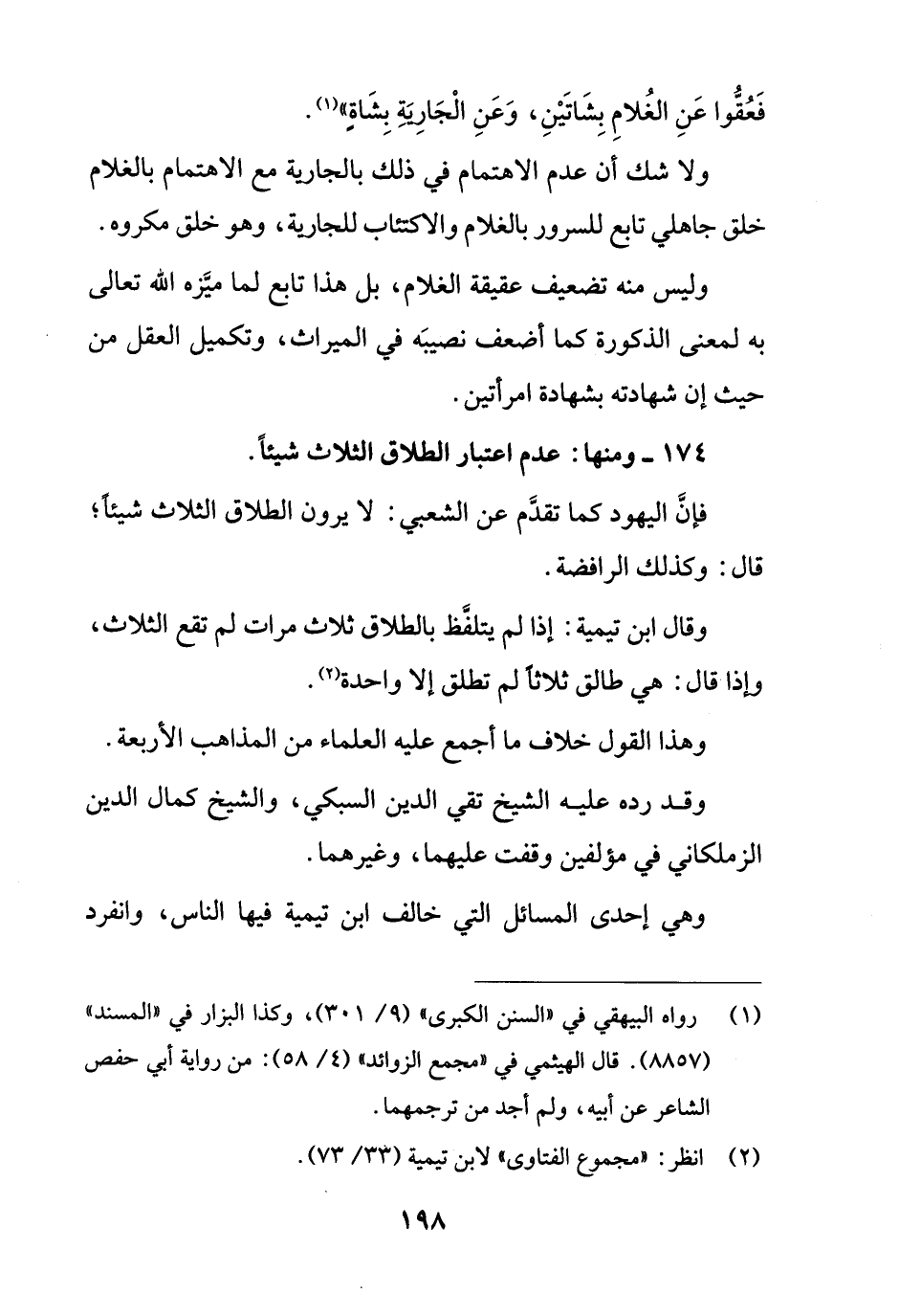 174 - ومنها: عدم اعتبار الطلاق الثلاث شيئاً.