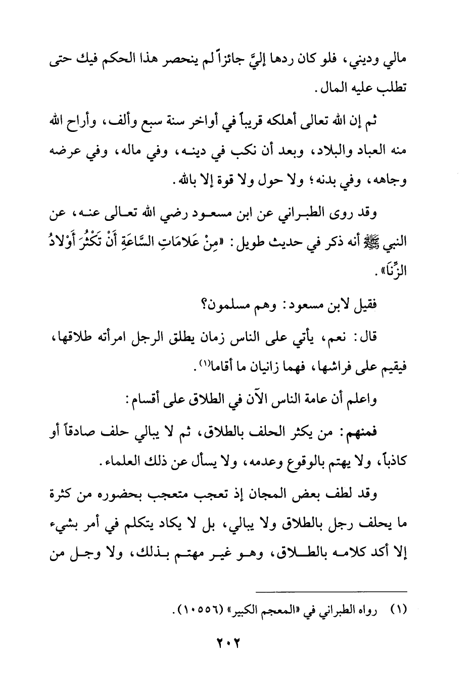 وقد لطف بعض المجان إذ تعجب متعجب بحضوره من كثرة ما يحلف رجل بالطلاق ولا يبالي، بل لا يكاد يتكلم في أمر بشيء إلا أكد كلامه بالطلاق، وهو غير مهتم بذلك، ولا وجل من