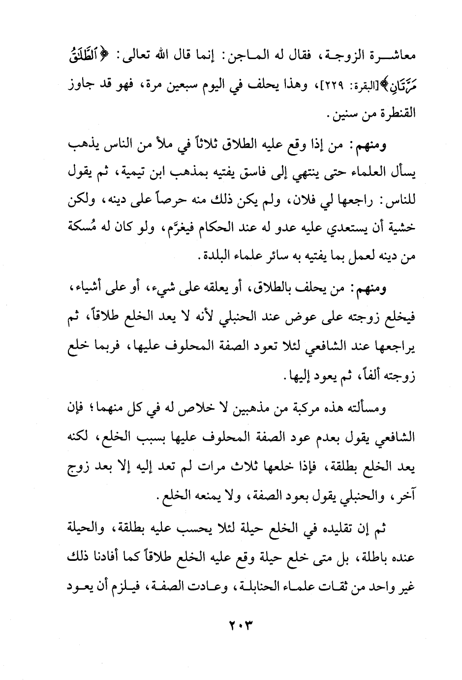 ومنهم: من إذا وقع عليه الطلاق ثلاثًا في ملأ من الناس يذهب يسأل العلماء حتى ينتهي إلى فاسق يفتيه بمذهب ابن تيمية، ثم يقول للناس: راجعها لي فلان، ولم يكن ذلك منه حرصاً على دينه، ولكن خشية أن يستعدي عليه عدو له عند الحكام فيغرَّم، ولو كان له مُسكة من دينه لعمل بما يفتيه به سائر علماء البلدة.