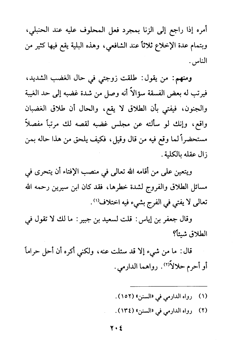 ويتعين على من أقامه الله تعالى في منصب الإفتاء أن يتحرى في مسائل الطلاق والفروج لشدة خطرها، فقد كان ابن سيرين رحمه الله تعالى لا يفتي في الفرج بشيء فيه اختلاف (¬1).
