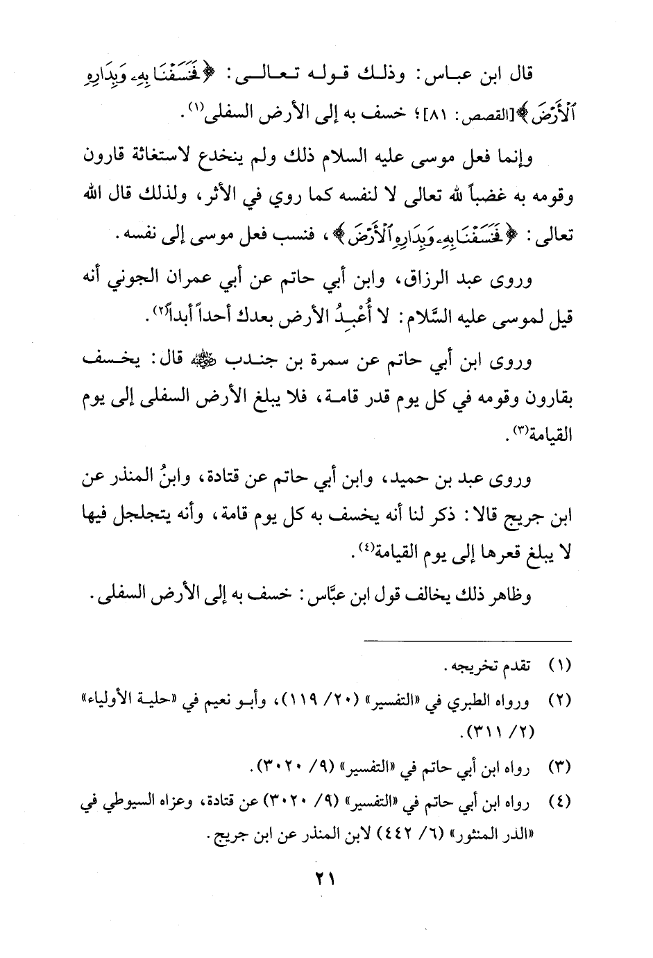وروى ابن أبي حاتم عن سمرة بن جندب - رضي الله عنه - قال: يخسف بقارون وقومه في كل يوم قدر قامة، فلا يبلغ الأرض السفلى إلى يوم القيامة (¬3).