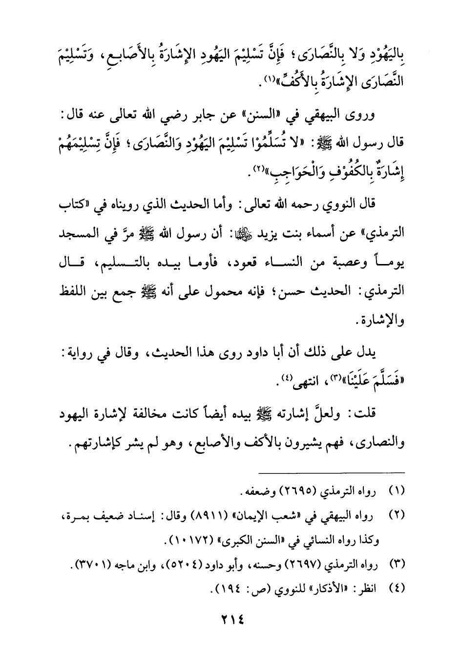 وروى البيهقي في "السنن" عن جابر رضي الله تعالى عنه قال: قال رسول الله - صلى الله عليه وسلم -: "لا تُسَلمُوْا تَسْلِيْمَ اليَهُوْدِ وَالنَّصَارَى؛ فَإِنَّ تِسْلِيْمَهُمْ إِشَارَة بِالكُفُوْفِ وَالْحَوَاجِبِ" (¬2).