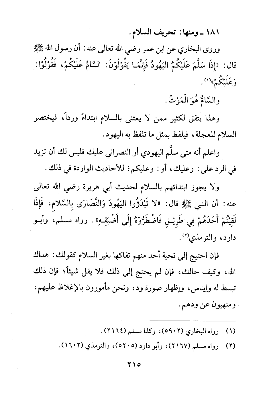 وروى البخاري عن ابن عمر رضي الله تعالى عنه: أن رسول الله - صلى الله عليه وسلم - قال: "إِذَا سَلَّمَ عَلَيْكُمُ اليَهُودُ فَإِنَّمَا يَقُوْلُوْنَ: السَّامُّ عَلَيْكُمْ، فَقُوْلُوْا: وَعَلَيْكُمْ" (¬1).