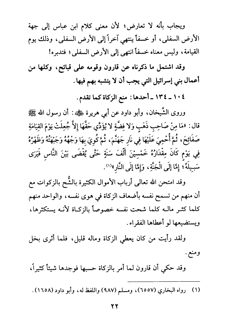 وروى الشَّيخان، وأبو داود عن أبي هريرة - رضي الله عنه -: أن رسول الله -صلى الله عليه وسلم- قال: "ما مِنْ صَاحِبِ ذَهَبٍ وَلا فِضَّةٍ لا يُؤَدِّي حَقَّها إِلَّا جُعِلَتْ يَوْمَ القِيامَةِ صَفائِحَ، ثُمَّ أُحْمِيَ عَلَيْها في نَارِ جَهَنَّمَ، ثُمَّ كُوِيَ بِها وَجْهُهُ وَجَبْهَتُهُ وَظَهْرُهُ في يَوْمٍ كانَ مِقْدارُهُ خَمْسِيْنَ ألفَ سَنَةٍ حَتَّى يُقْضَى بَيْنَ النَّاسِ فَيَرَى سَبِيلَهُ؛ إِمَّا إلَى الْجَنَّةِ، وَإِمَّا إلَى النارِ" (¬1).