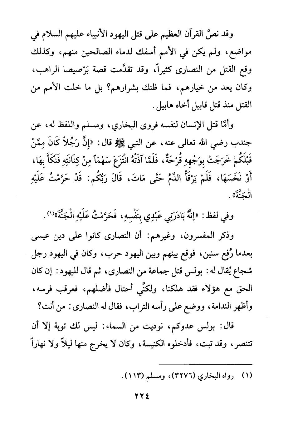وقد نصَّ القرآن العظيم على قتل اليهود الأنبياء عليهم السلام في مواضع، ولم يكن في الأمم أسفك لدماء الصالحين منهم، وكذلك وقع القتل من النصارى كثيرًا، وقد تقدمت قصة بَرْصيصا الراهب، وكان يعد من خيارهم، فما ظنك بشرارهم؟ بل ما خلت الأمم من القتل منذ قتل قابيل أخاه هابيل.