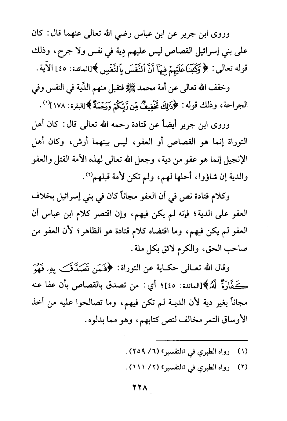 وروى ابن جرير أيضًا عن قتادة رحمه الله تعالى قال: كان أهل التوراة إنما هو القصاص أو العفو, ليس بينهما أرش، وكان أهل الإنجيل إنما هو عفو من دية، وجعل الله تعالى لهذه الأمة القتل والعفو والدية إن شاؤوا، أحلها لهم، ولم تكن لأمة قبلهم (¬2).