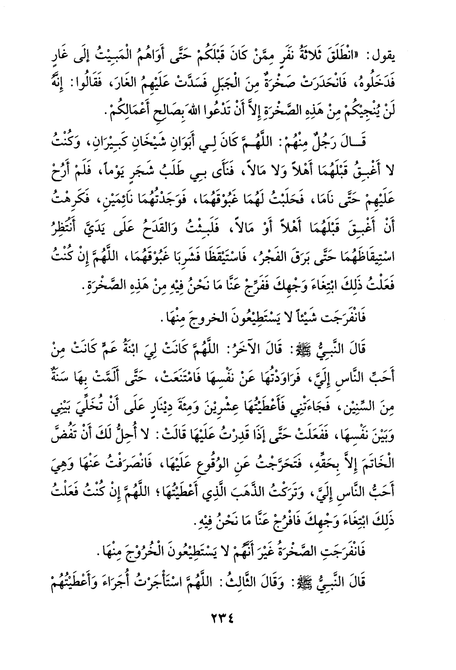 يقول: "انْطَلَقَ ثَلاثَةُ نفُرٍ مِمَنْ كَانَ قَبْلَكُمْ حَتَّى أَوَاهُمُ الْمَبِيْتُ إلَى غَارٍ فَدَخَلُوهُ، فَانْحَدَرَتْ صَخْرَةٌ مِنَ الْجَبَلِ فَسَدَّتْ عَلَيْهِمُ الغَارَ، فَقَالُوا: إِنَّهُ لَنْ يُنْجِيْكُمْ مِنْ هَذِهِ الصَّخْرَةِ إِلاَّ أَنْ تَدْعُوا اللهَ بِصالحِ أَعْمَالِكُمْ.
