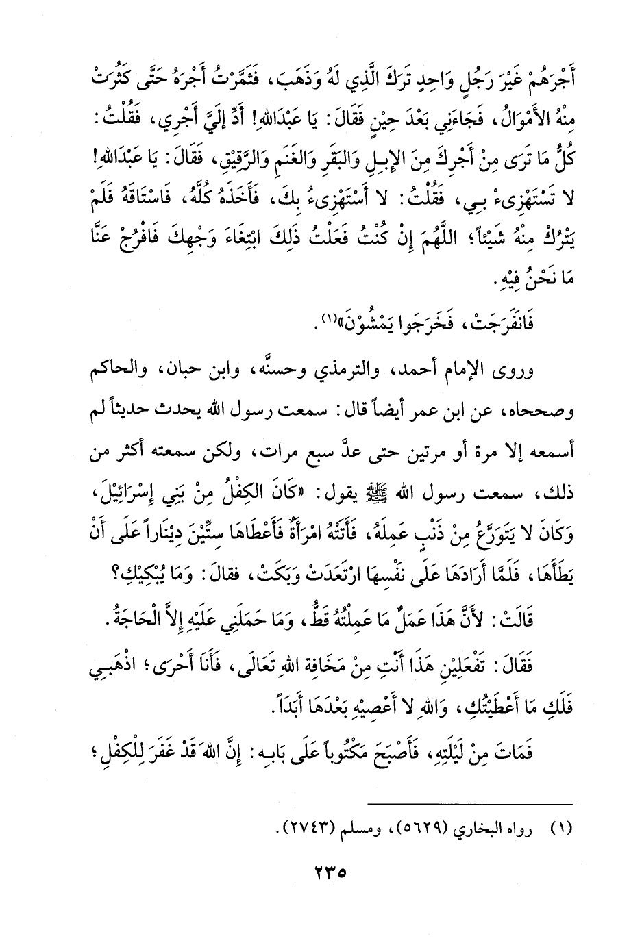 وروى الإِمام أحمد، والترمذي وحسنَّه، وابن حبان، والحاكم وصححاه، عن ابن عمر أيضًا قال: سمعت رسول الله يحدث حديثاً لم أسمعه إلا مرة أو مرتين حتى عدَّ سبع مرات، ولكن سمعته أكثر من ذلك، سمعت رسول الله - صلى الله عليه وسلم - يقول: "كَانَ الكِفْلُ مِنْ بَنِي إِسْرَائِيْلَ، وَكَانَ لا يَتَوَرَّعُ مِنْ ذَنْبٍ عَمِلَهُ، فَأَتتهُ امْرَأةٌ فَأَعْطَاهَا سِتِّيْنَ دِيْنَاراً عَلَى أَنْ يَطَأَهَا، فَلَمَّا أَرَادَهَا عَلَى نَفْسِهَا ارْتَعَدَتْ وَبَكَتْ، فقالَ: وَمَا يُبْكِيْكِ؟