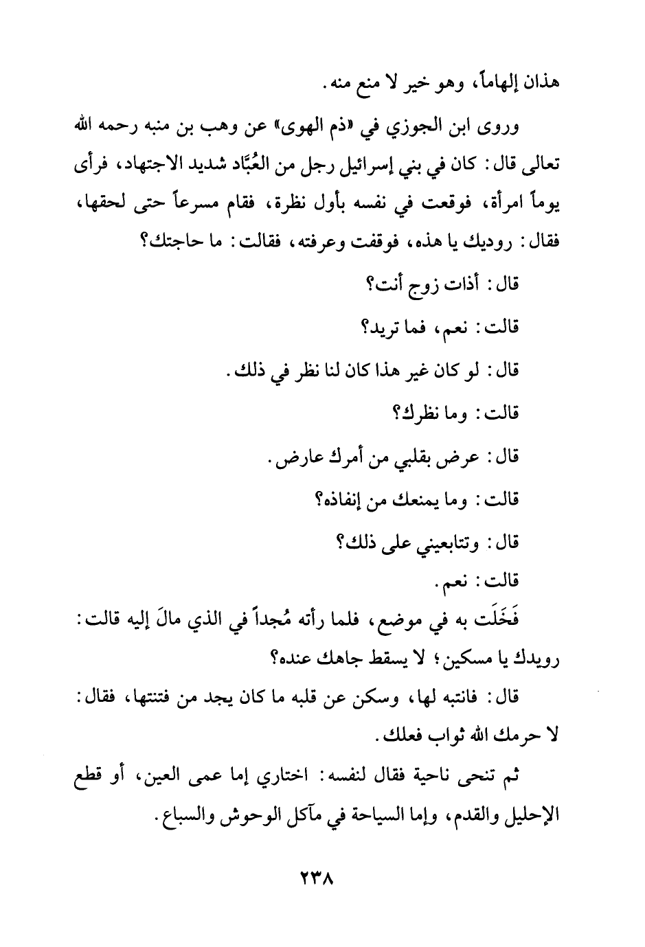 وروى ابن الجوزي في "ذم الهوى" عن وهب بن منبه رحمه الله تعالى قال: كان في بني إسرائيل رجل من العُبَّاد شديد الاجتهاد، فرأى يوما امرأة، فوقعت في نفسه بأول نظرة، فقام مسرعاً حتى لحقها، فقال: روديك يا هذه، فوقفت وعرفته، فقالت: ما حاجتك؟